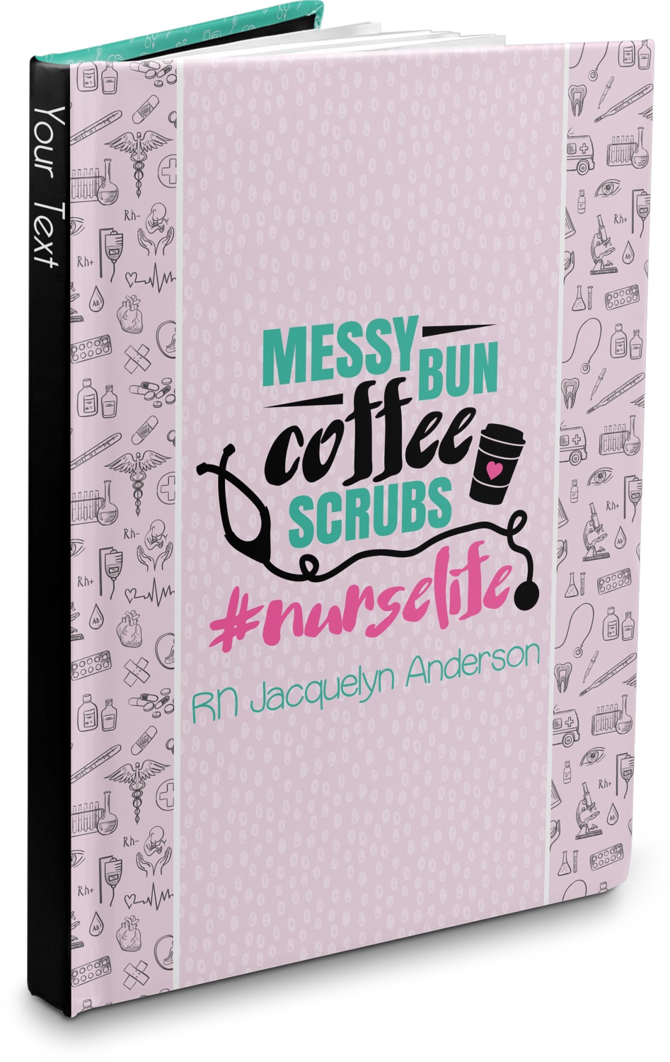 This design features a quote saying "messy bun, coffee, scrubs, #nurselife." The background has two different subtle patterns. One has subtle dots, while the other has fun illustrations of different medical tools and symbols. The two backgrounds are a soft pink. The quote has several different colors including pink, black, and teal.