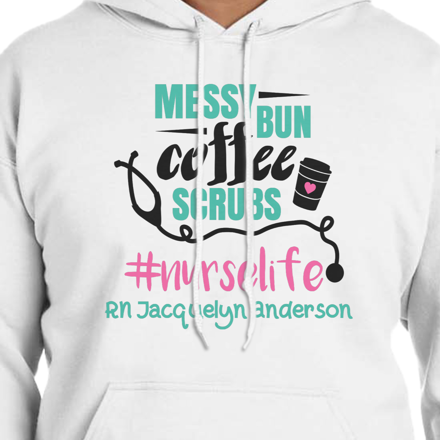 This design features a quote saying "messy bun, coffee, scrubs, #nurselife." The background has two different subtle patterns. One has subtle dots, while the other has fun illustrations of different medical tools and symbols. The two backgrounds are a soft pink. The quote has several different colors including pink, black, and teal.