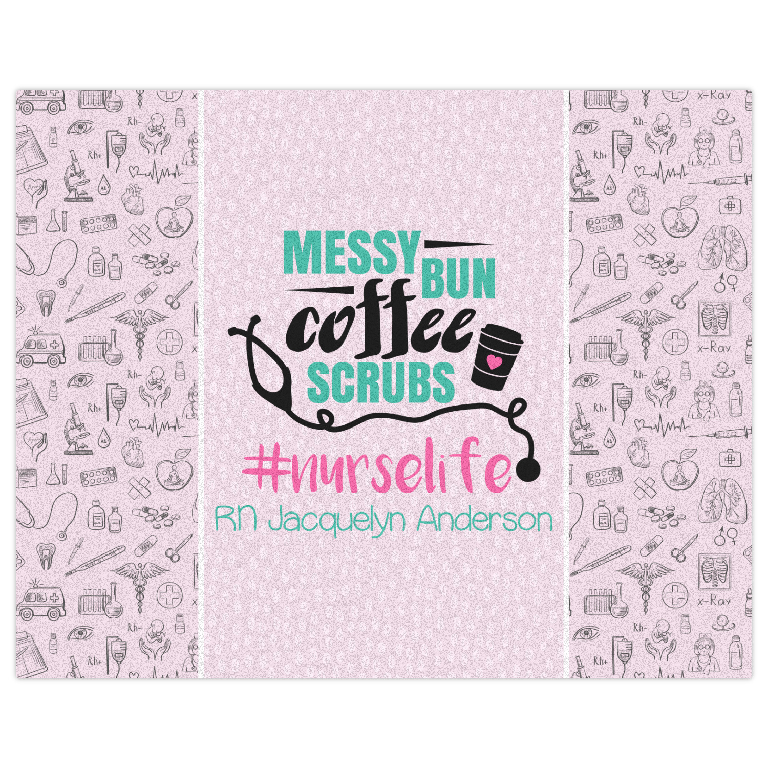 This design features a quote saying "messy bun, coffee, scrubs, #nurselife." The background has two different subtle patterns. One has subtle dots, while the other has fun illustrations of different medical tools and symbols. The two backgrounds are a soft pink. The quote has several different colors including pink, black, and teal.