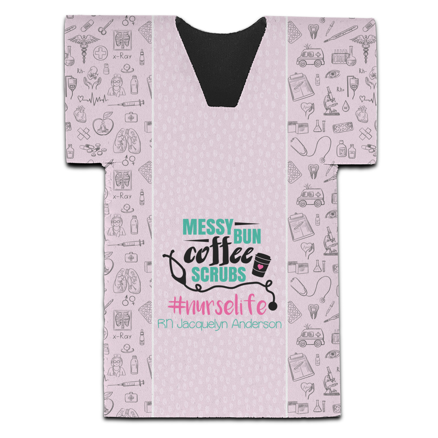 This design features a quote saying "messy bun, coffee, scrubs, #nurselife." The background has two different subtle patterns. One has subtle dots, while the other has fun illustrations of different medical tools and symbols. The two backgrounds are a soft pink. The quote has several different colors including pink, black, and teal.