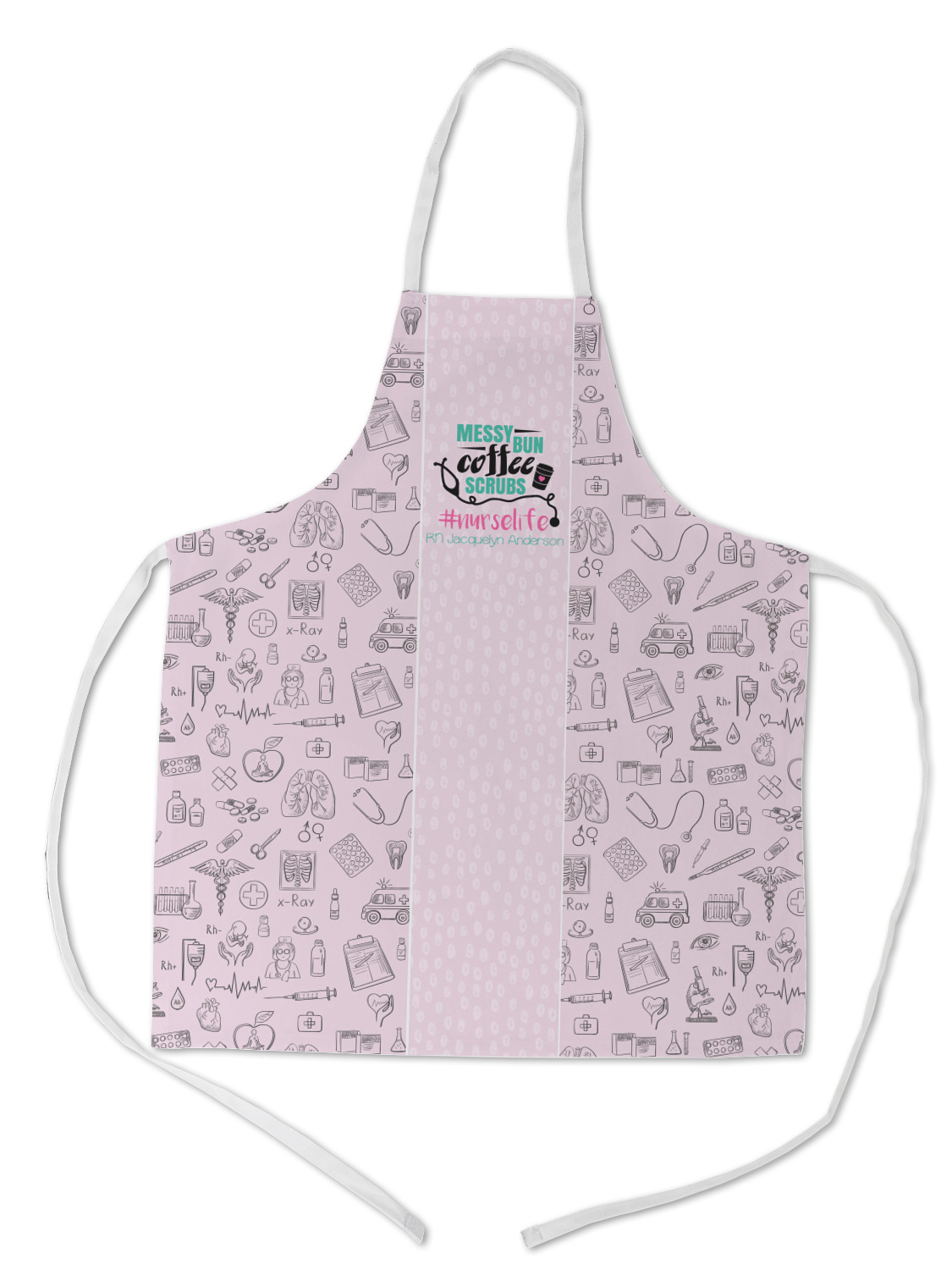 This design features a quote saying "messy bun, coffee, scrubs, #nurselife." The background has two different subtle patterns. One has subtle dots, while the other has fun illustrations of different medical tools and symbols. The two backgrounds are a soft pink. The quote has several different colors including pink, black, and teal.