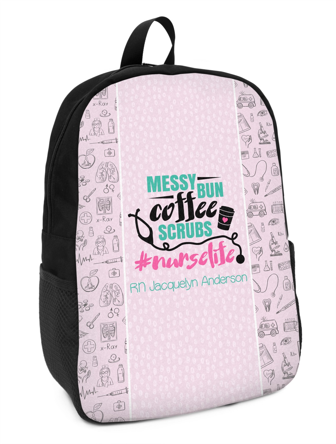 This design features a quote saying "messy bun, coffee, scrubs, #nurselife." The background has two different subtle patterns. One has subtle dots, while the other has fun illustrations of different medical tools and symbols. The two backgrounds are a soft pink. The quote has several different colors including pink, black, and teal.