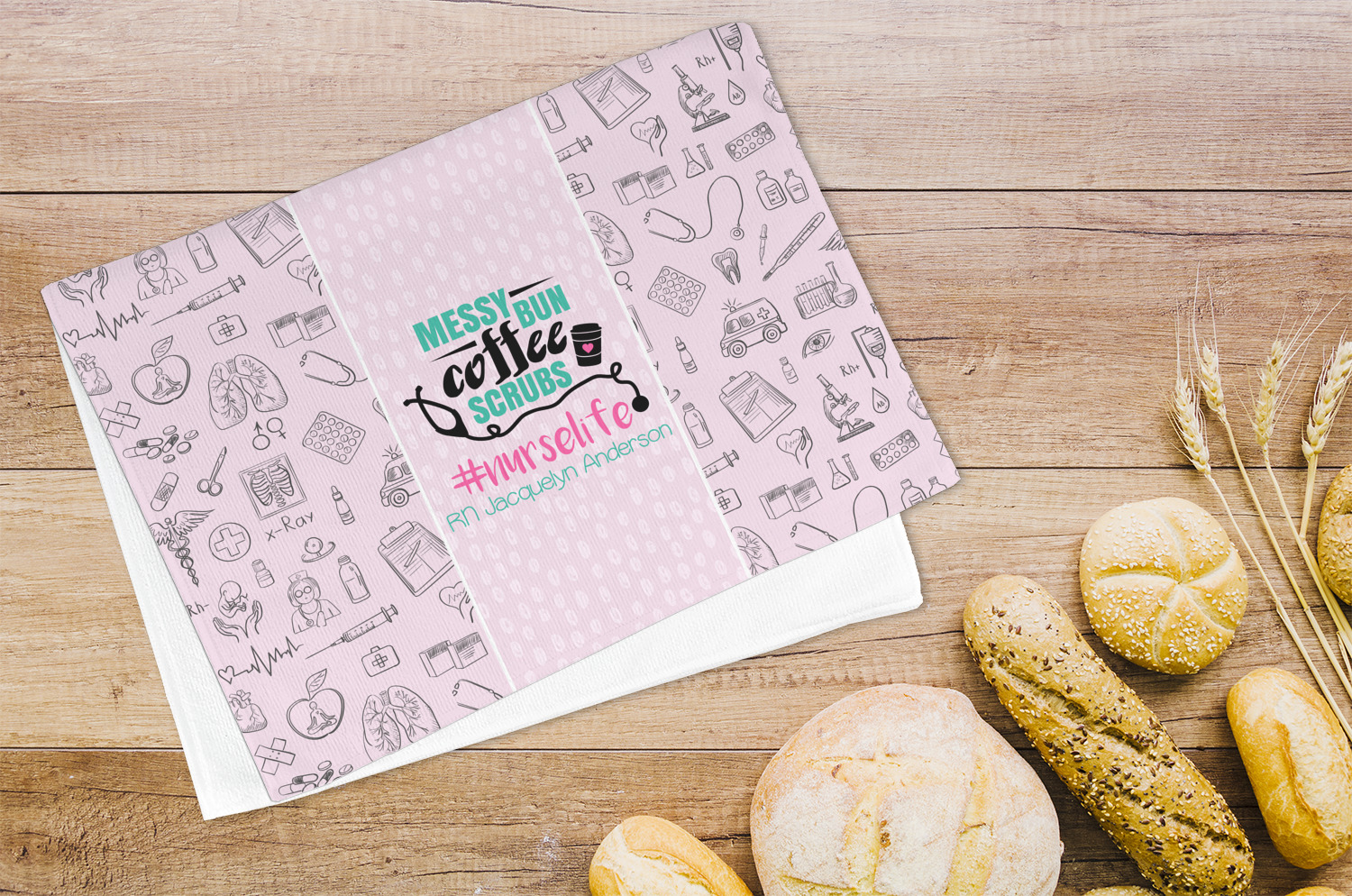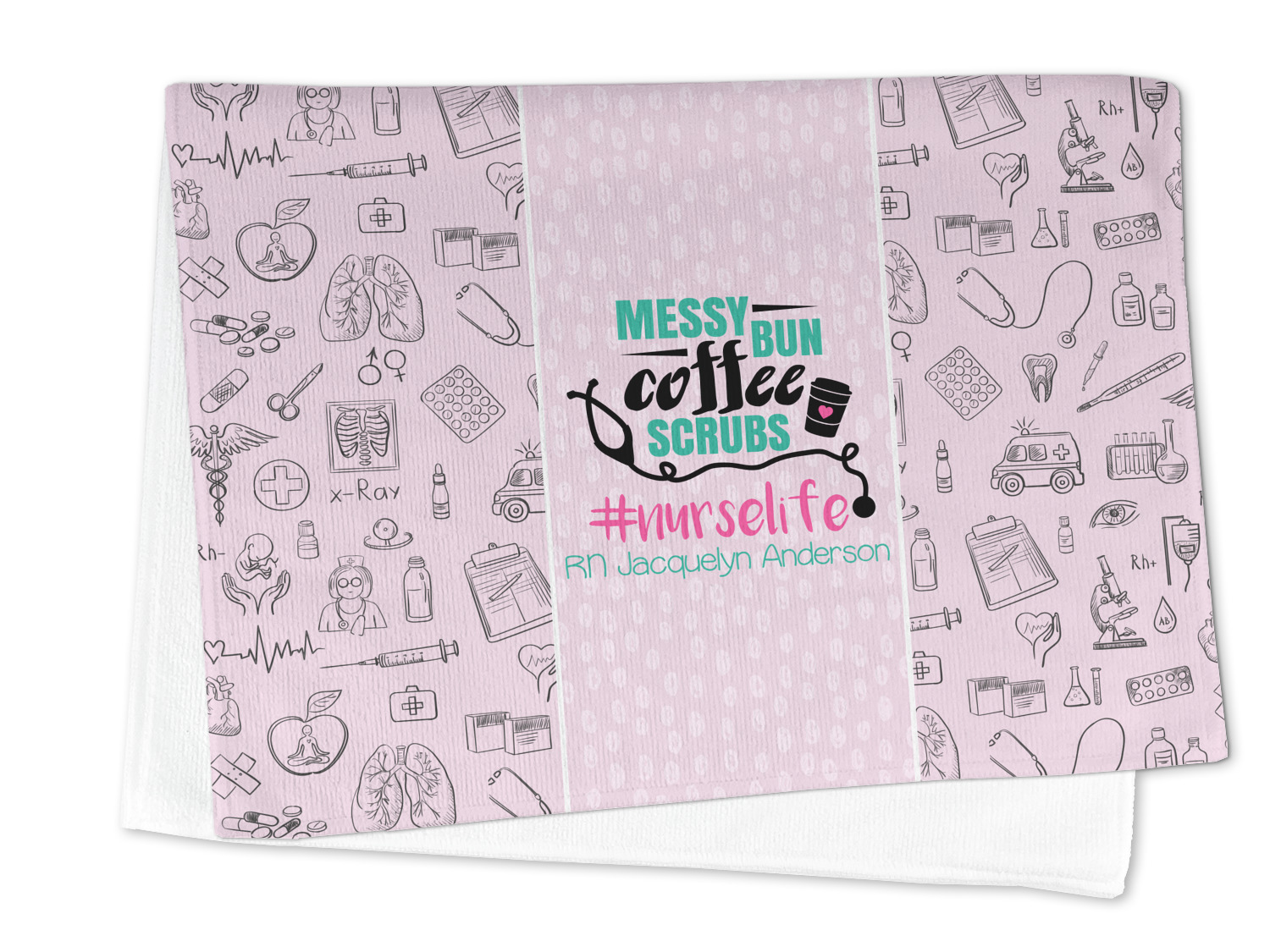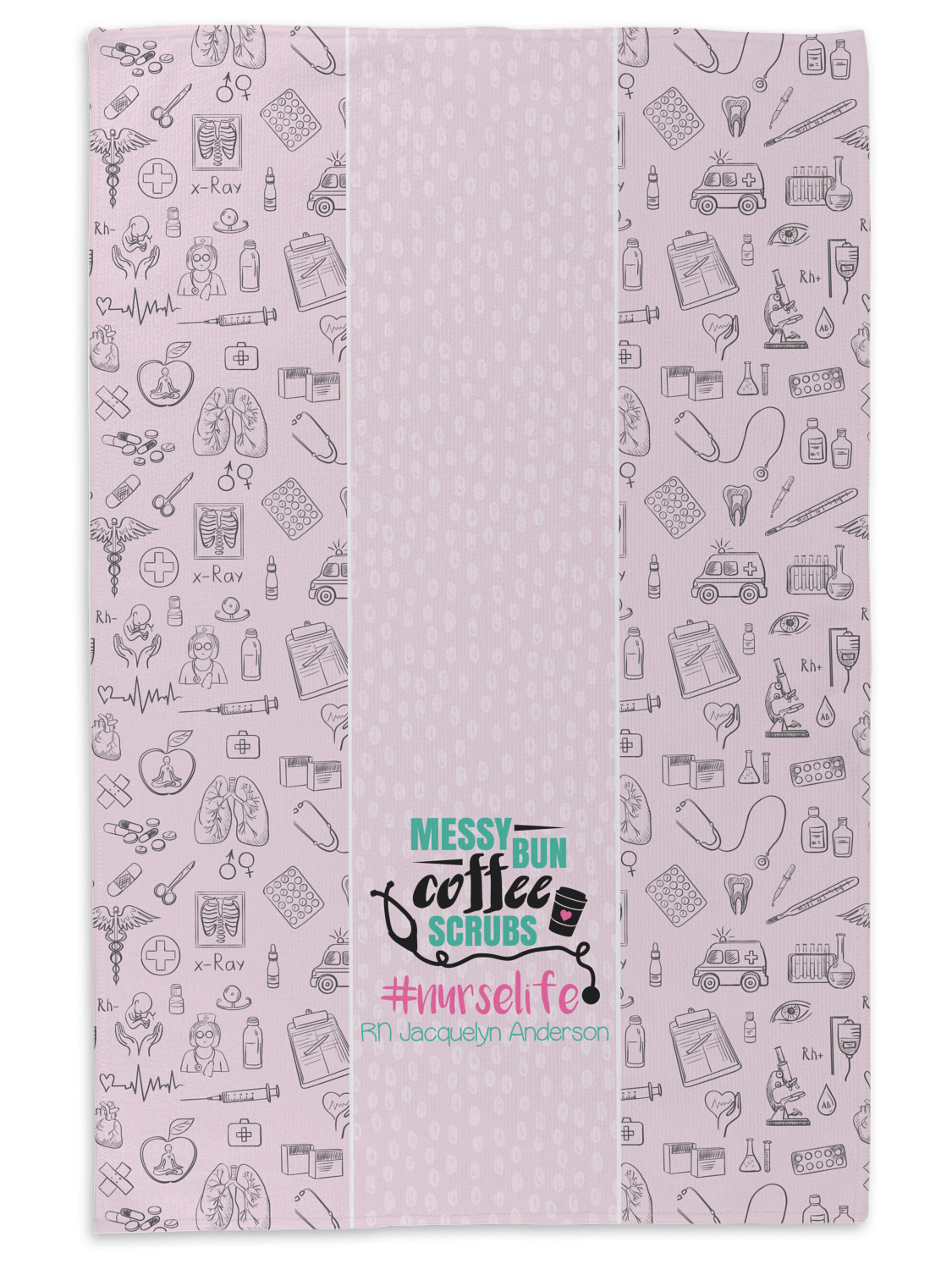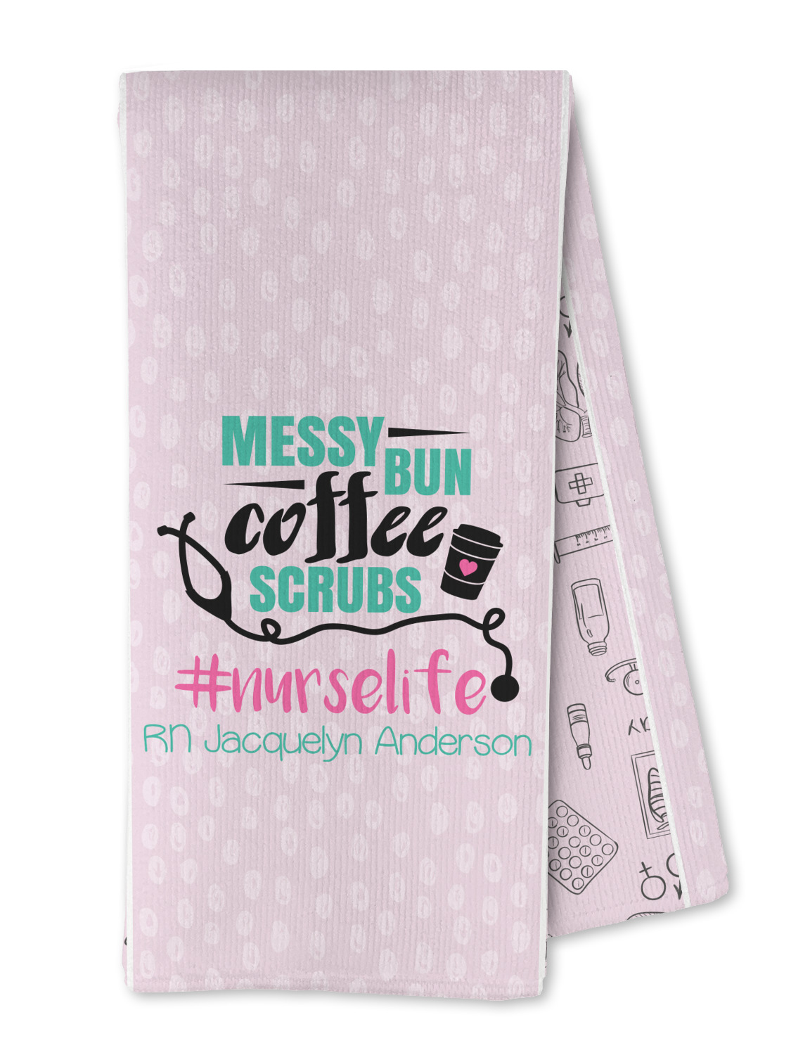 This design features a quote saying "messy bun, coffee, scrubs, #nurselife." The background has two different subtle patterns. One has subtle dots, while the other has fun illustrations of different medical tools and symbols. The two backgrounds are a soft pink. The quote has several different colors including pink, black, and teal.