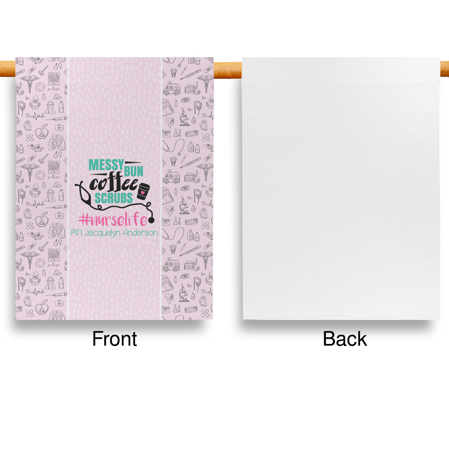 This design features a quote saying "messy bun, coffee, scrubs, #nurselife." The background has two different subtle patterns. One has subtle dots, while the other has fun illustrations of different medical tools and symbols. The two backgrounds are a soft pink. The quote has several different colors including pink, black, and teal.