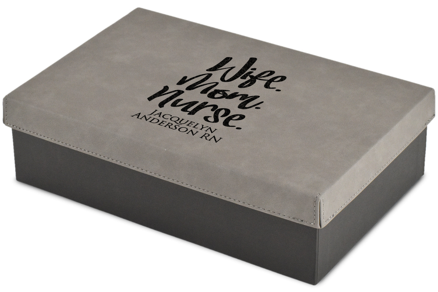 These gift boxes are available in 3 different sizes to accommodate various sized gifts. Available in gray as a neutral color for any occasion as well as to showcase your design boldly. Engraved with a laser this high quality paper board and faux leather gift box is unique and makes any gift stand out.