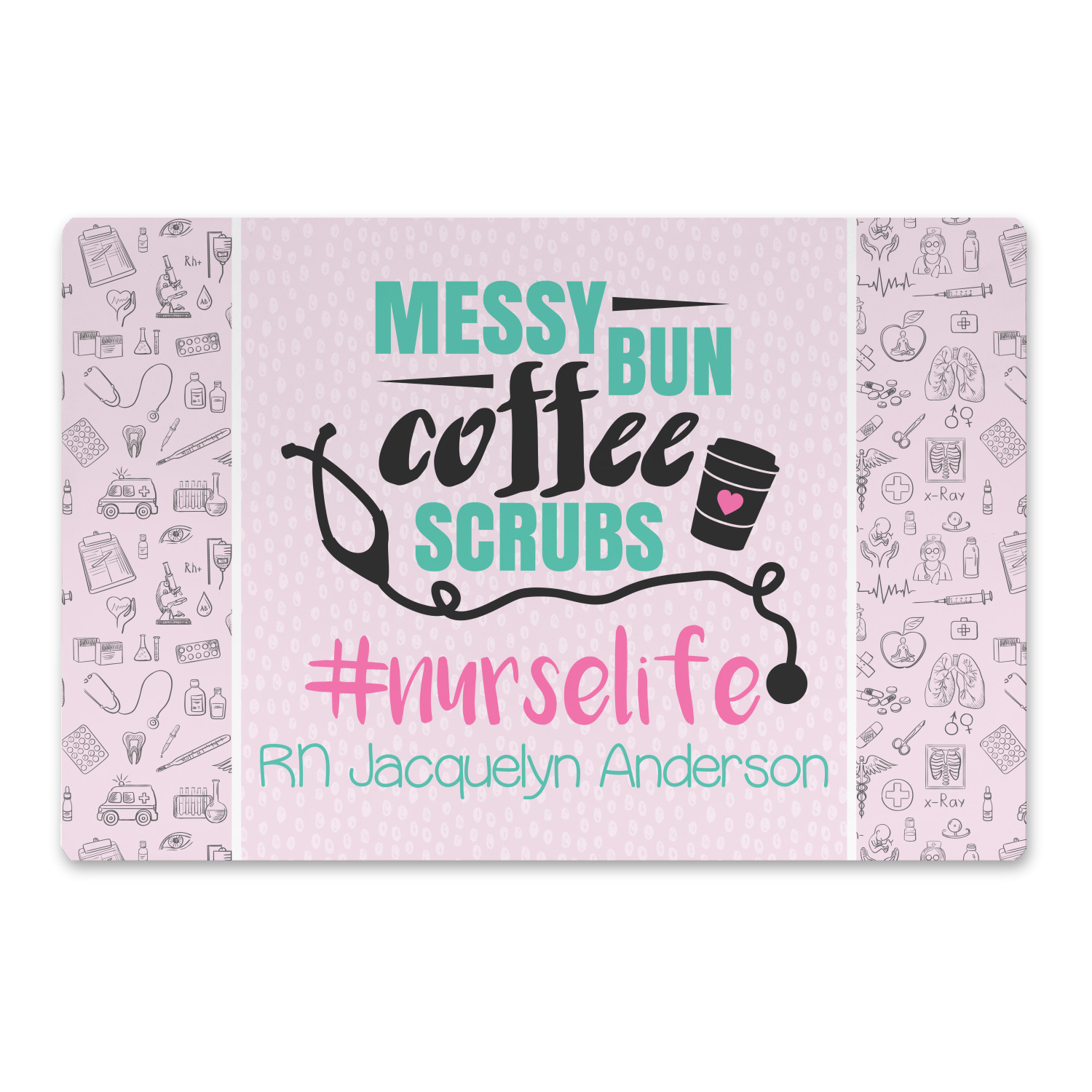 This design features a quote saying "messy bun, coffee, scrubs, #nurselife." The background has two different subtle patterns. One has subtle dots, while the other has fun illustrations of different medical tools and symbols. The two backgrounds are a soft pink. The quote has several different colors including pink, black, and teal.