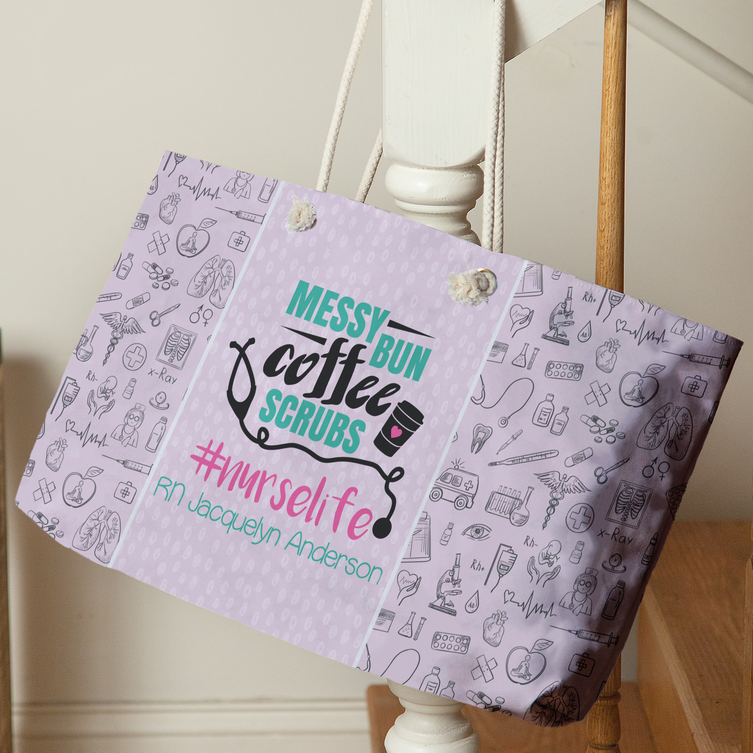This design features a quote saying "messy bun, coffee, scrubs, #nurselife." The background has two different subtle patterns. One has subtle dots, while the other has fun illustrations of different medical tools and symbols. The two backgrounds are a soft pink. The quote has several different colors including pink, black, and teal.