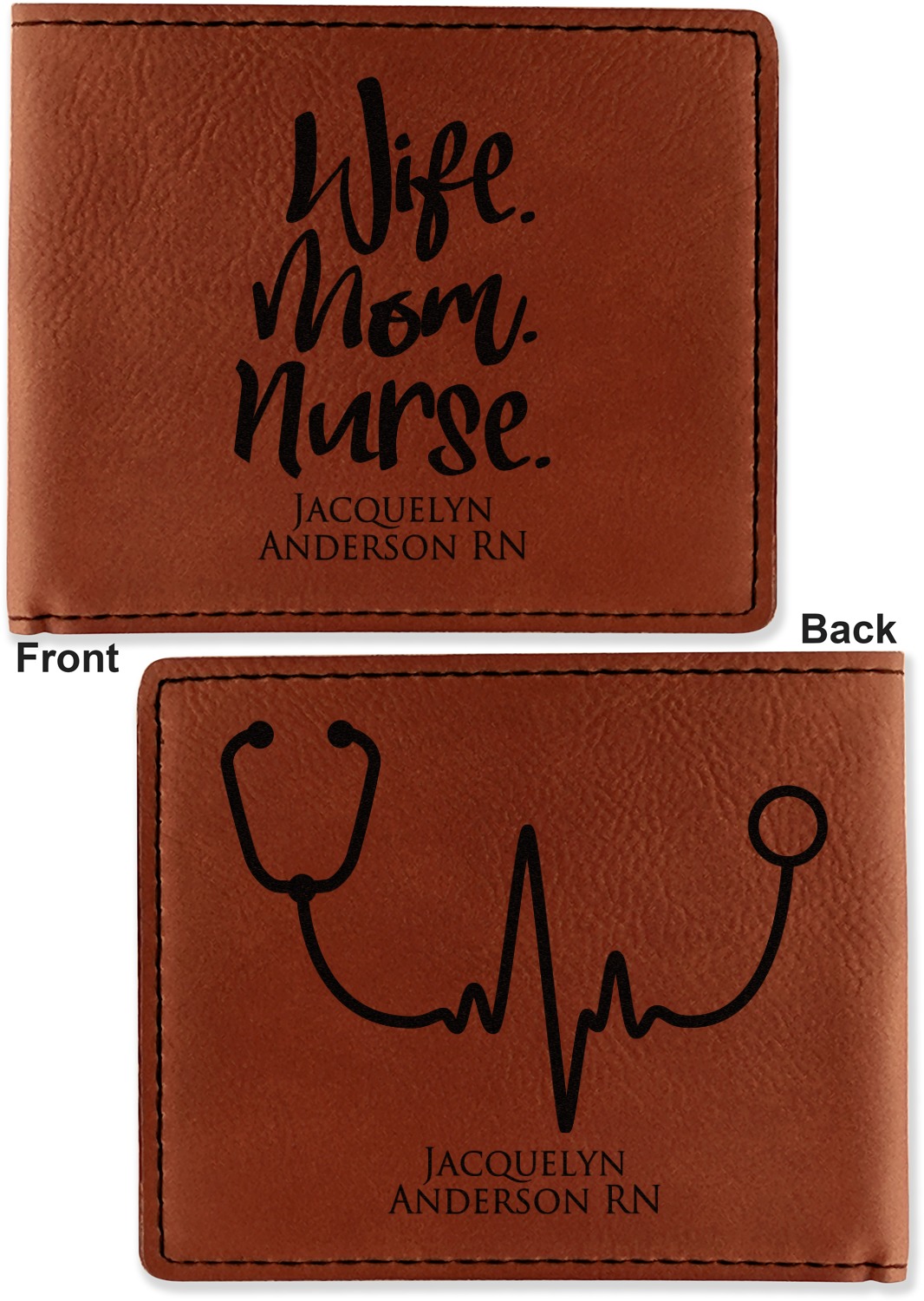 Your bifold wallet will be personalized by laser engraving, which will be a black color on the wallet. Choose a graphic, text, or monogram to personalize your wallet. There are thousands of choices in our design center.