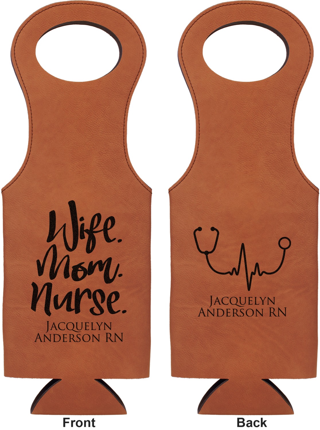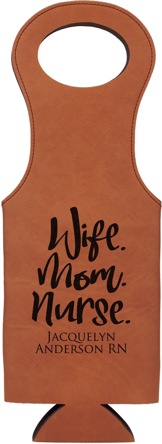 This wine carrier is made from a stunning leatherette, in a cognac-brown color. Strong, black stitching lines the sides of your wine bottle bag and provides extra durability. The interior is lined with a padded, black material to allow for a snug fit once your bottle is placed inside. At the top of this wine gift bag, you'll find two oval shaped handles that elegantly complements the rest of the bag's style. We provide you with the option of laser-engraving the front, or the front and back of your new personalized wine bag!