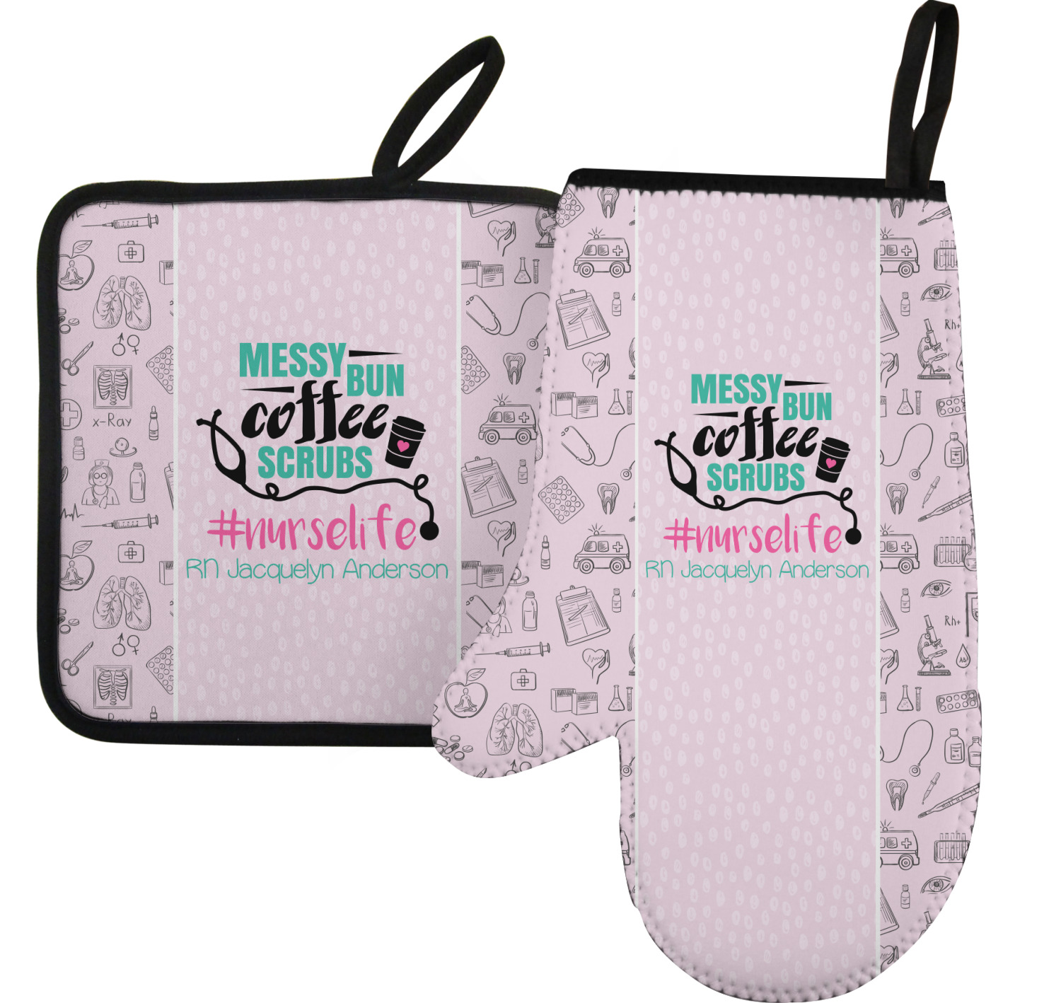 This design features a quote saying "messy bun, coffee, scrubs, #nurselife." The background has two different subtle patterns. One has subtle dots, while the other has fun illustrations of different medical tools and symbols. The two backgrounds are a soft pink. The quote has several different colors including pink, black, and teal.