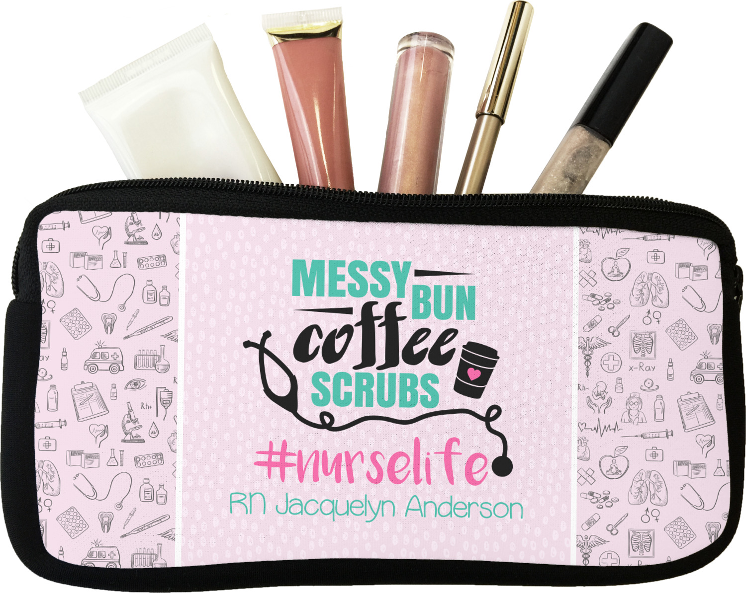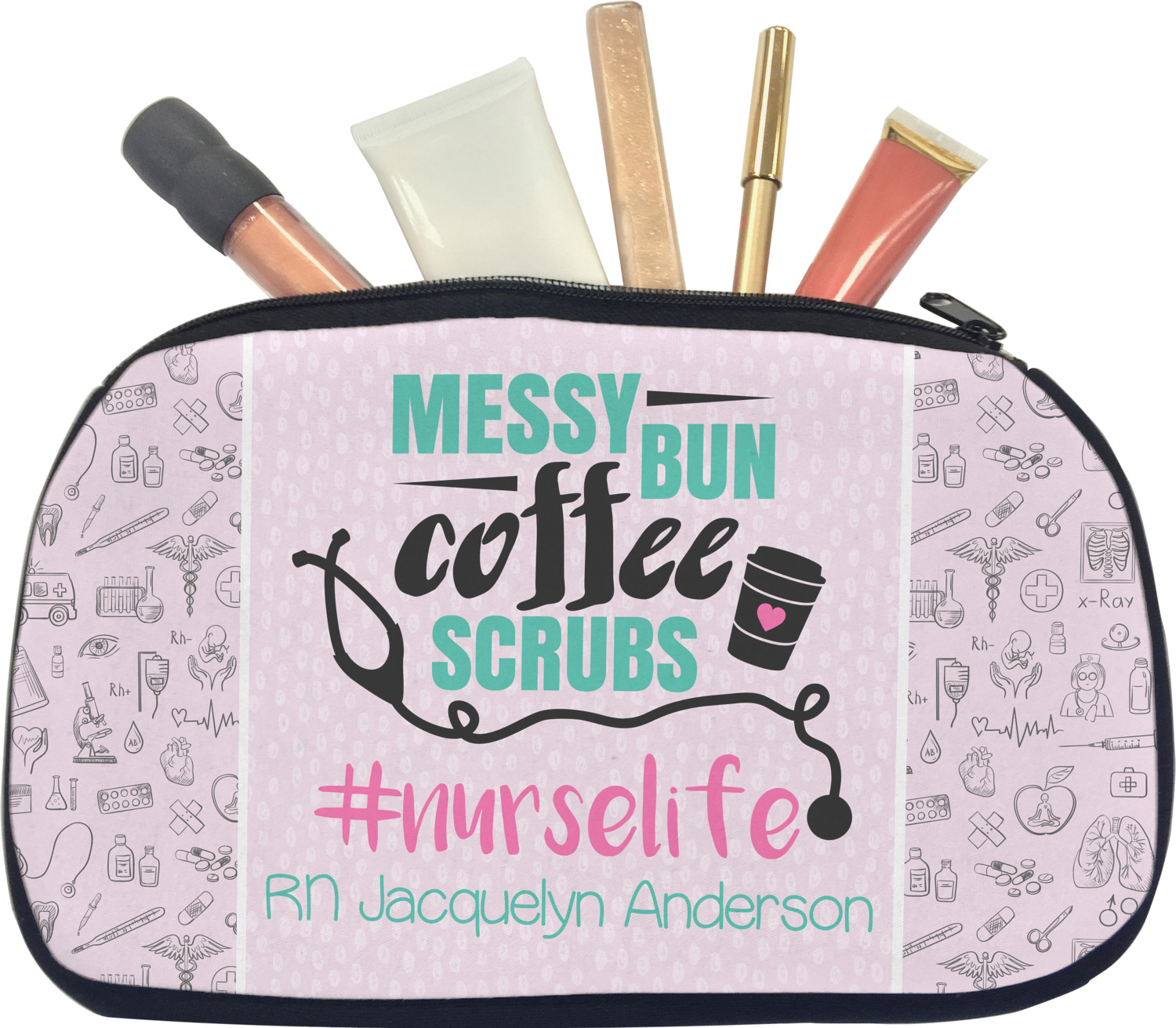 This design features a quote saying "messy bun, coffee, scrubs, #nurselife." The background has two different subtle patterns. One has subtle dots, while the other has fun illustrations of different medical tools and symbols. The two backgrounds are a soft pink. The quote has several different colors including pink, black, and teal.