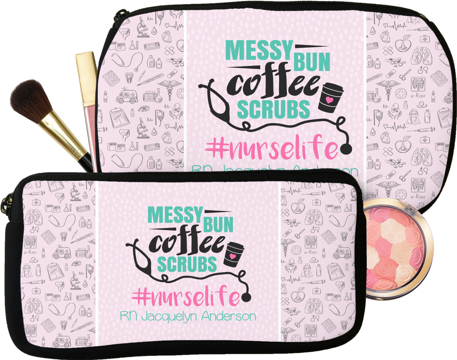 Our personalized makeup bags are available in many different designs, patterns and colors - so you are sure to find one that will love. They are made of neoprene (same material as wet-suits) and thus are water resistant, so spillages in your makeup bag will not end up all over you purse. They are customized on one side and are black on the other side and the zipper is black as well.