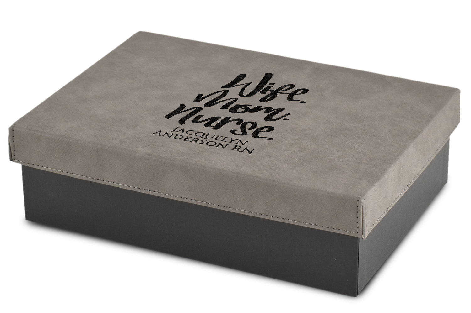 These gift boxes are available in 3 different sizes to accommodate various sized gifts. Available in gray as a neutral color for any occasion as well as to showcase your design boldly. Engraved with a laser this high quality paper board and faux leather gift box is unique and makes any gift stand out.