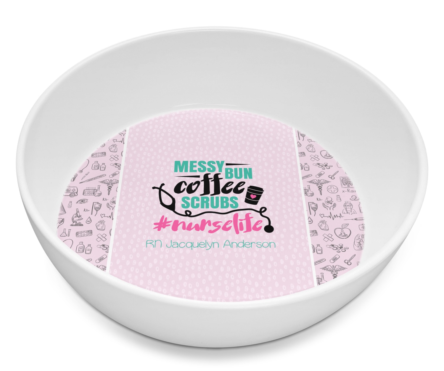 Our melamine dinnerware are BPA free, break-resistant, and dishwasher safe. Our first model has a more functional, standard look, and can hold up to 8 ounces of liquid. The second version we offer has a tapered edge and can hold up to 12 ounces of liquid. Both bowls display your customization on the base of the bowl's inside, and the exterior of the two models are both white.