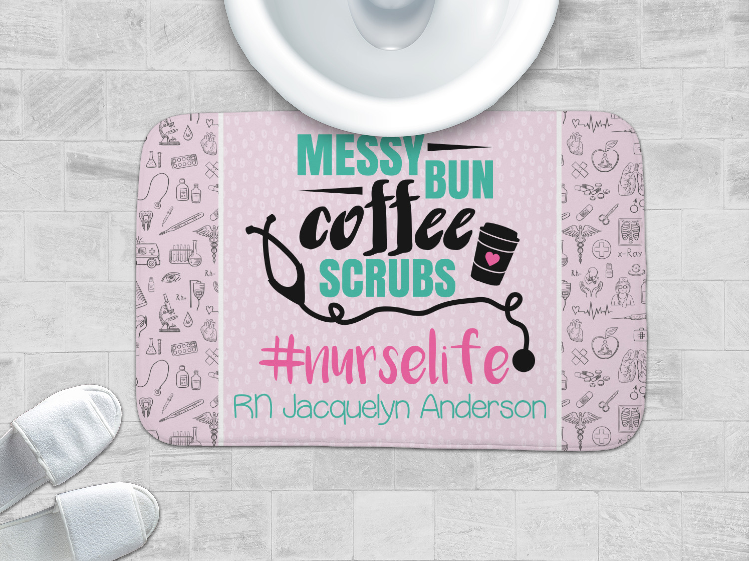 This design features a quote saying "messy bun, coffee, scrubs, #nurselife." The background has two different subtle patterns. One has subtle dots, while the other has fun illustrations of different medical tools and symbols. The two backgrounds are a soft pink. The quote has several different colors including pink, black, and teal.