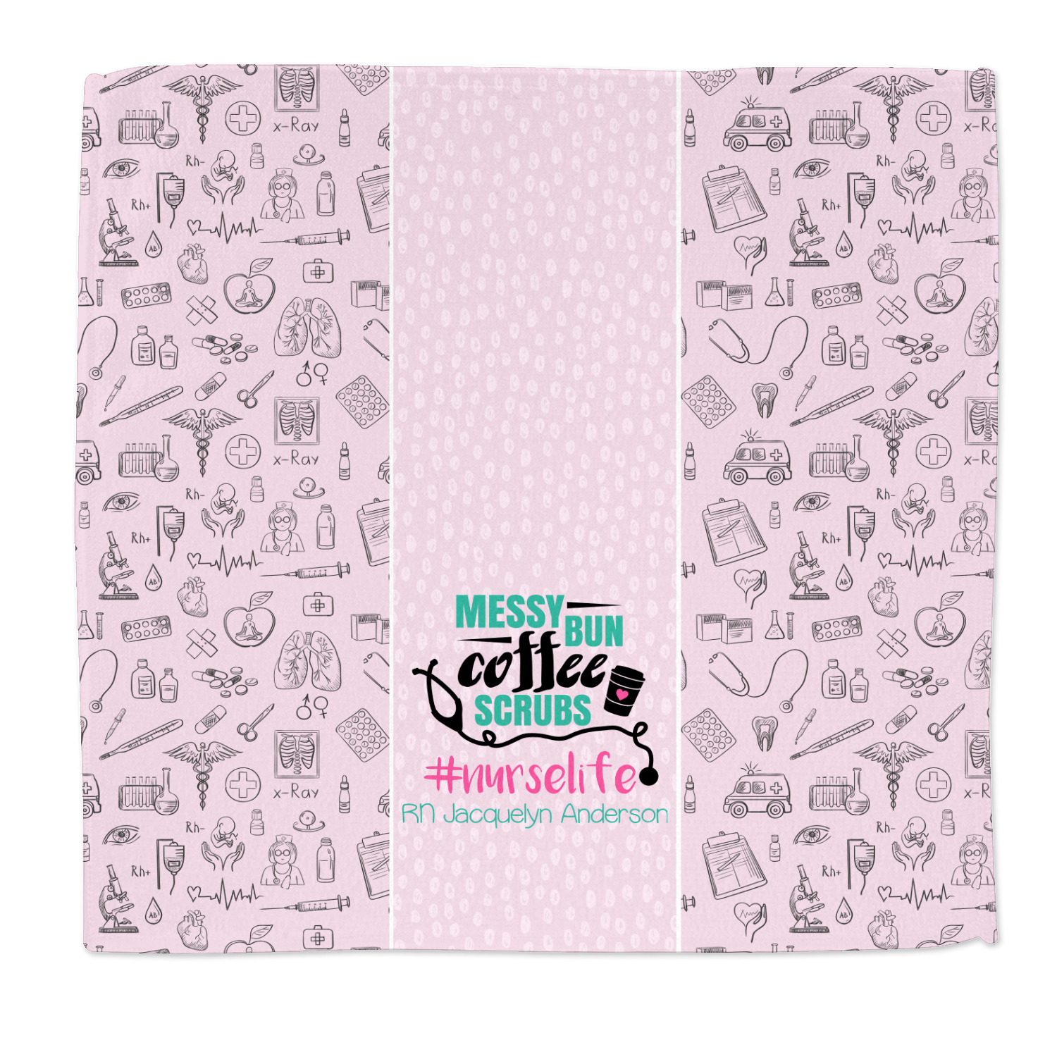 This design features a quote saying "messy bun, coffee, scrubs, #nurselife." The background has two different subtle patterns. One has subtle dots, while the other has fun illustrations of different medical tools and symbols. The two backgrounds are a soft pink. The quote has several different colors including pink, black, and teal.