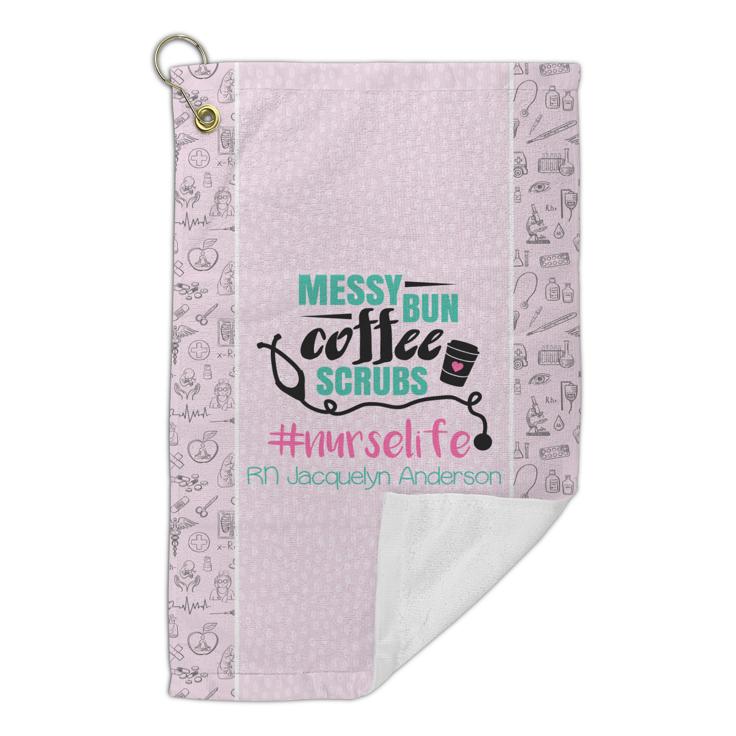 This design features a quote saying "messy bun, coffee, scrubs, #nurselife." The background has two different subtle patterns. One has subtle dots, while the other has fun illustrations of different medical tools and symbols. The two backgrounds are a soft pink. The quote has several different colors including pink, black, and teal.