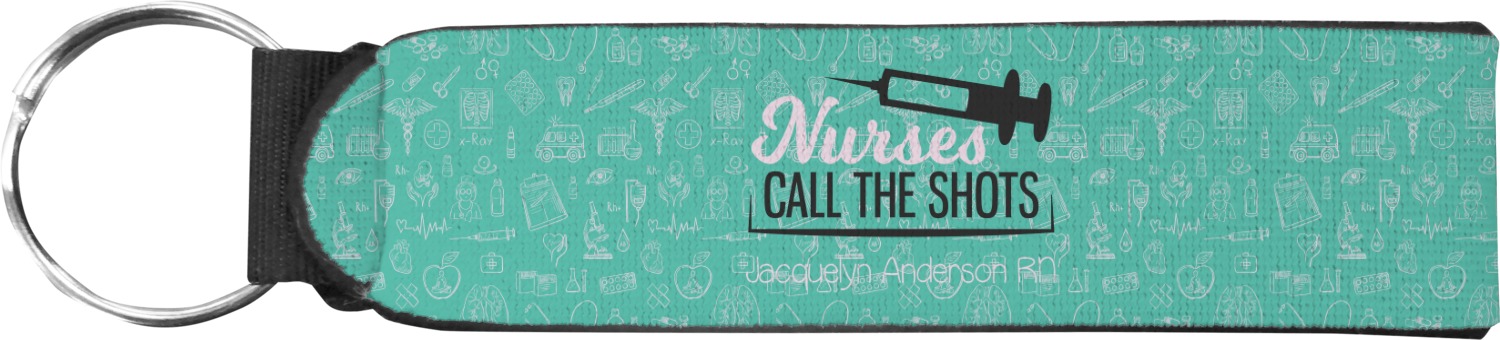 Made from neoprene, these key fob wristlets are comfortable, cushioned, easy to slip on and off; these traits allow it to maintain a slim, yet fashionable appearance, all while optimizing your efficiency. When attaching or removing keys, simply squeeze open the included metal ring. These fobs measure at around 4 inches, and have a bit of a stretch. Thus, they are best suited for small to medium size wrists. If you require a larger size, check out our webbing keychain fob for larger sizing.