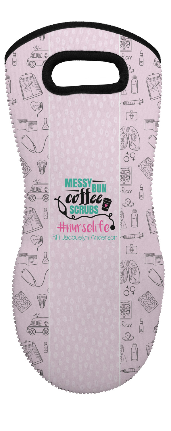 This design features a quote saying "messy bun, coffee, scrubs, #nurselife." The background has two different subtle patterns. One has subtle dots, while the other has fun illustrations of different medical tools and symbols. The two backgrounds are a soft pink. The quote has several different colors including pink, black, and teal.
