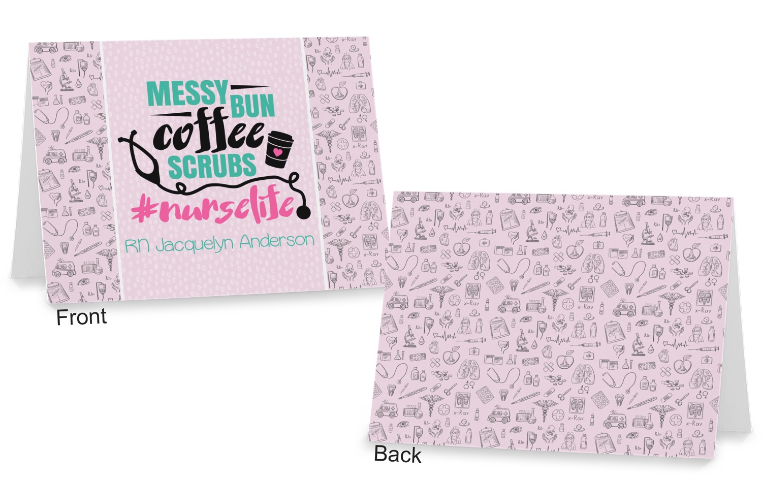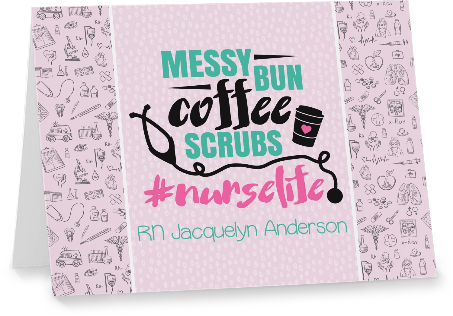This design features a quote saying "messy bun, coffee, scrubs, #nurselife." The background has two different subtle patterns. One has subtle dots, while the other has fun illustrations of different medical tools and symbols. The two backgrounds are a soft pink. The quote has several different colors including pink, black, and teal.