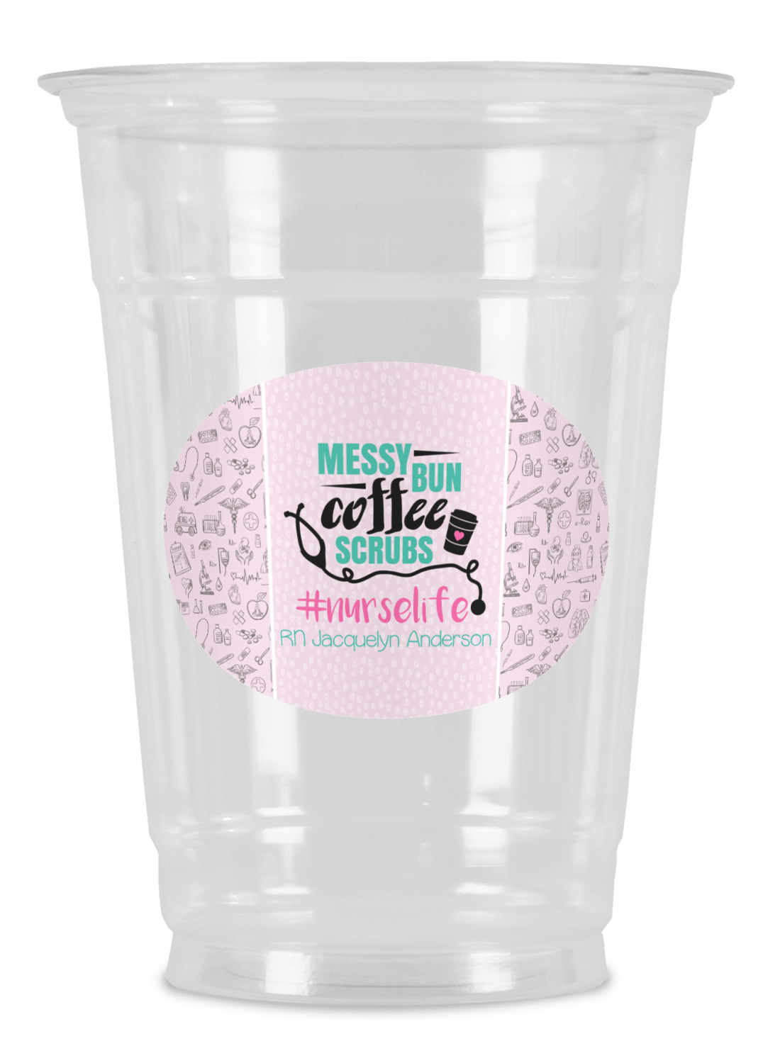 This design features a quote saying "messy bun, coffee, scrubs, #nurselife." The background has two different subtle patterns. One has subtle dots, while the other has fun illustrations of different medical tools and symbols. The two backgrounds are a soft pink. The quote has several different colors including pink, black, and teal.