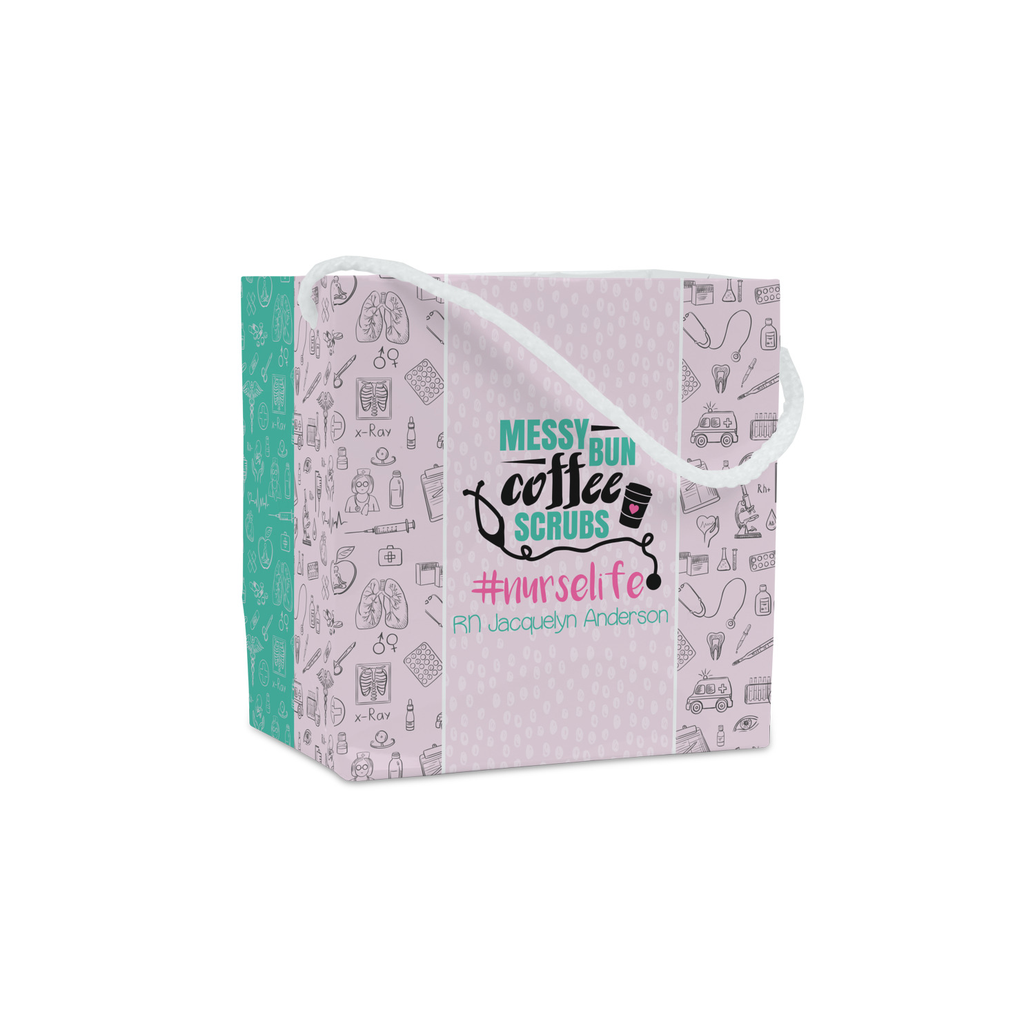 This design features a quote saying "messy bun, coffee, scrubs, #nurselife." The background has two different subtle patterns. One has subtle dots, while the other has fun illustrations of different medical tools and symbols. The two backgrounds are a soft pink. The quote has several different colors including pink, black, and teal.