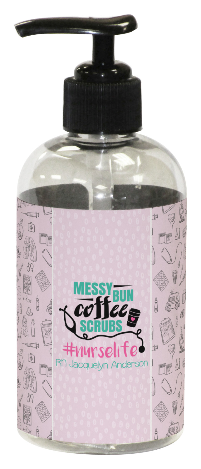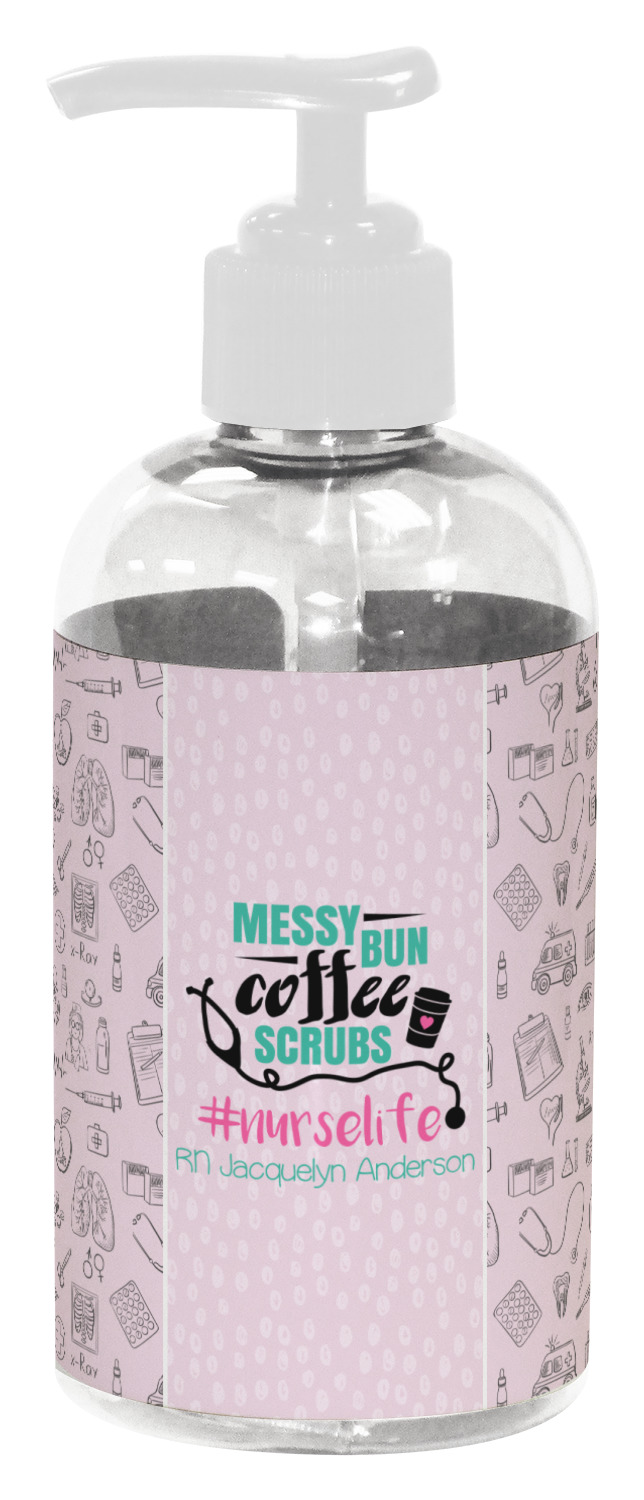 This design features a quote saying "messy bun, coffee, scrubs, #nurselife." The background has two different subtle patterns. One has subtle dots, while the other has fun illustrations of different medical tools and symbols. The two backgrounds are a soft pink. The quote has several different colors including pink, black, and teal.