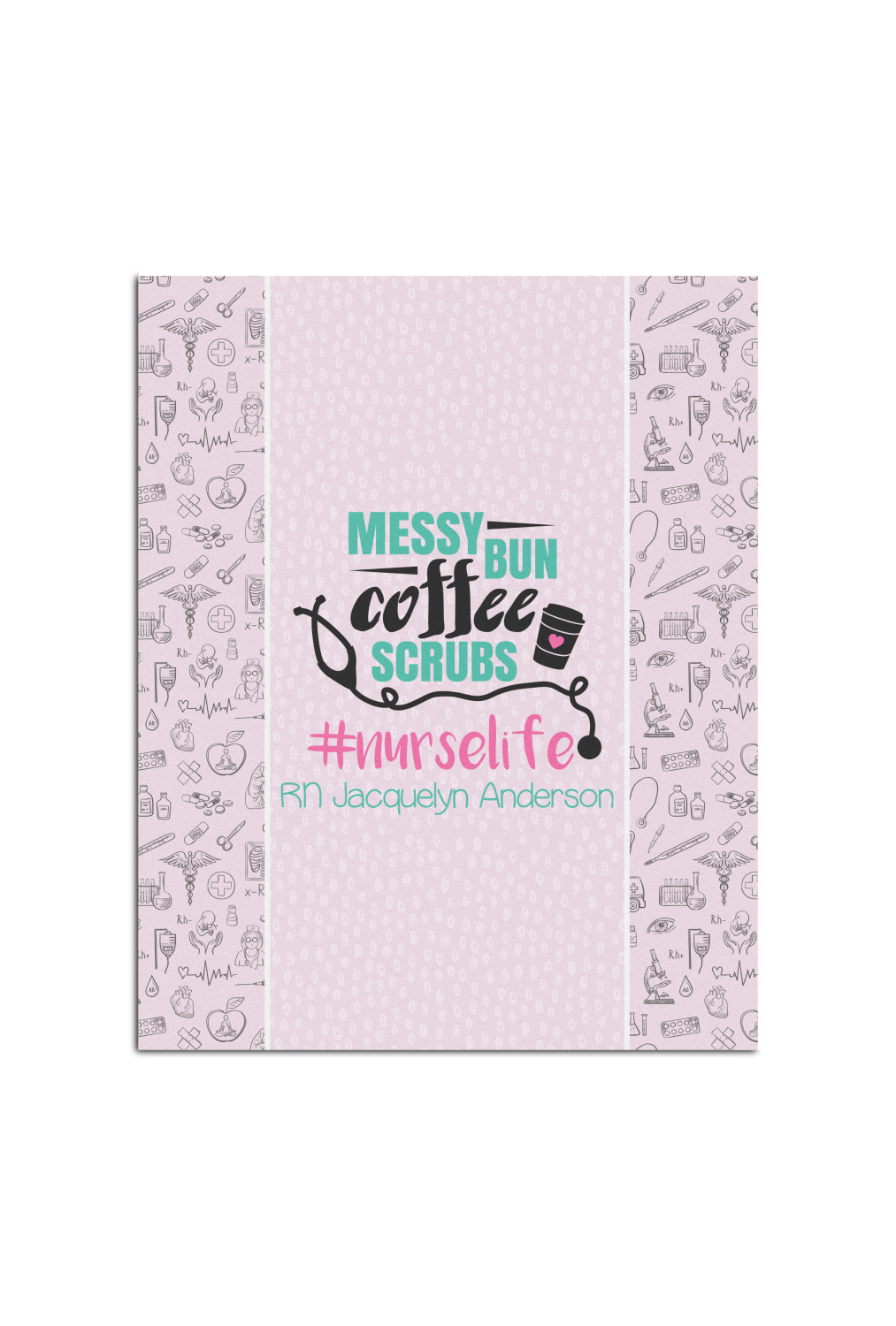 This design features a quote saying "messy bun, coffee, scrubs, #nurselife." The background has two different subtle patterns. One has subtle dots, while the other has fun illustrations of different medical tools and symbols. The two backgrounds are a soft pink. The quote has several different colors including pink, black, and teal.