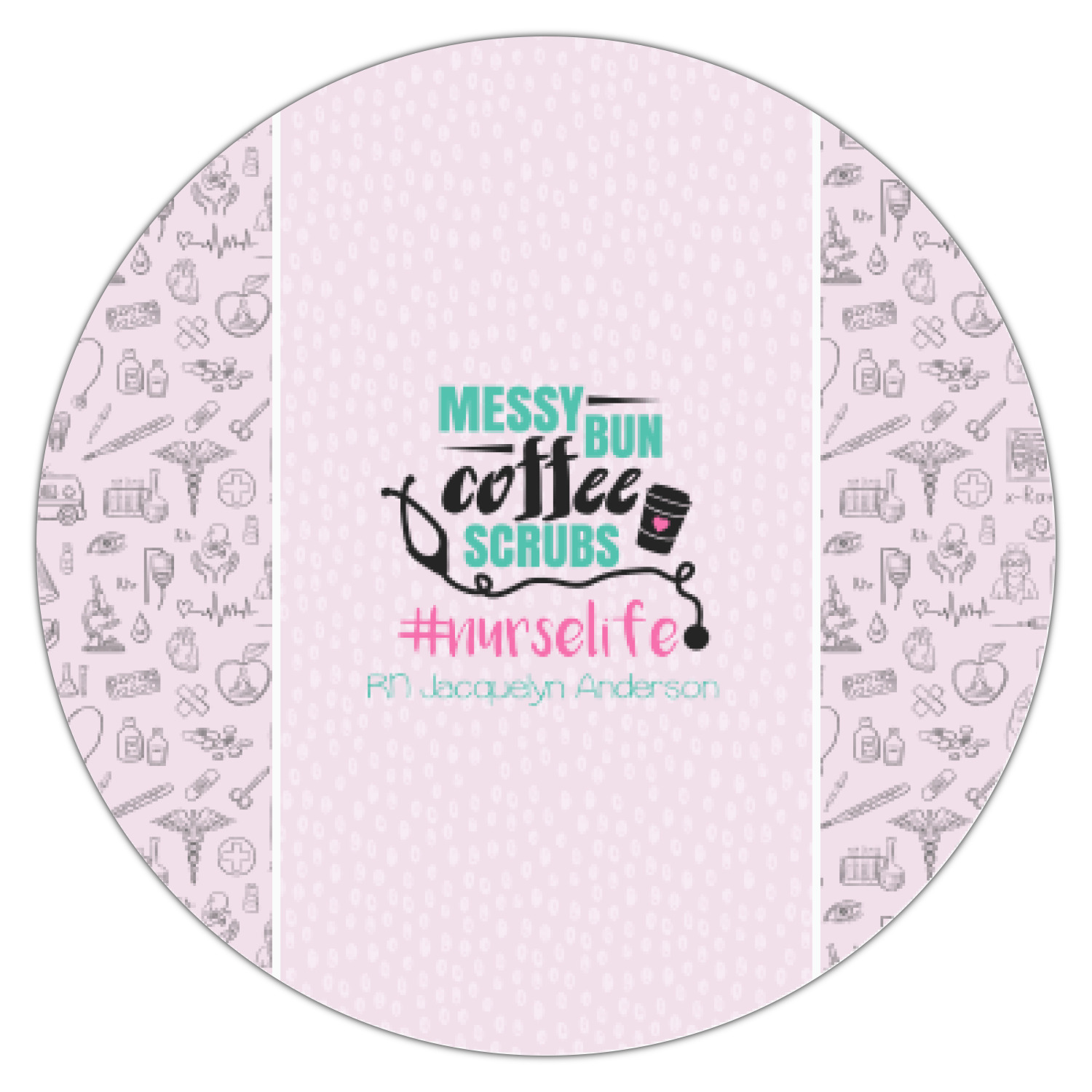 This design features a quote saying "messy bun, coffee, scrubs, #nurselife." The background has two different subtle patterns. One has subtle dots, while the other has fun illustrations of different medical tools and symbols. The two backgrounds are a soft pink. The quote has several different colors including pink, black, and teal.