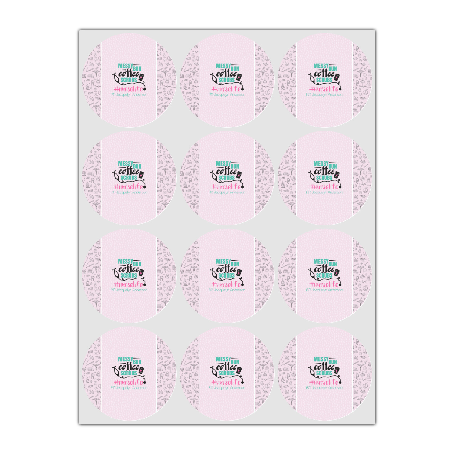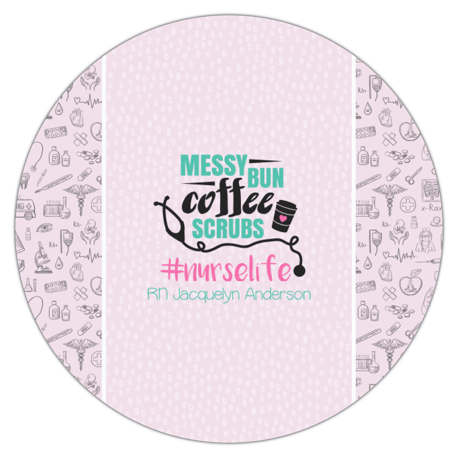 This design features a quote saying "messy bun, coffee, scrubs, #nurselife." The background has two different subtle patterns. One has subtle dots, while the other has fun illustrations of different medical tools and symbols. The two backgrounds are a soft pink. The quote has several different colors including pink, black, and teal.