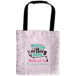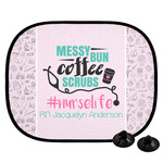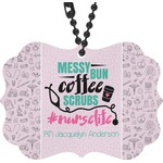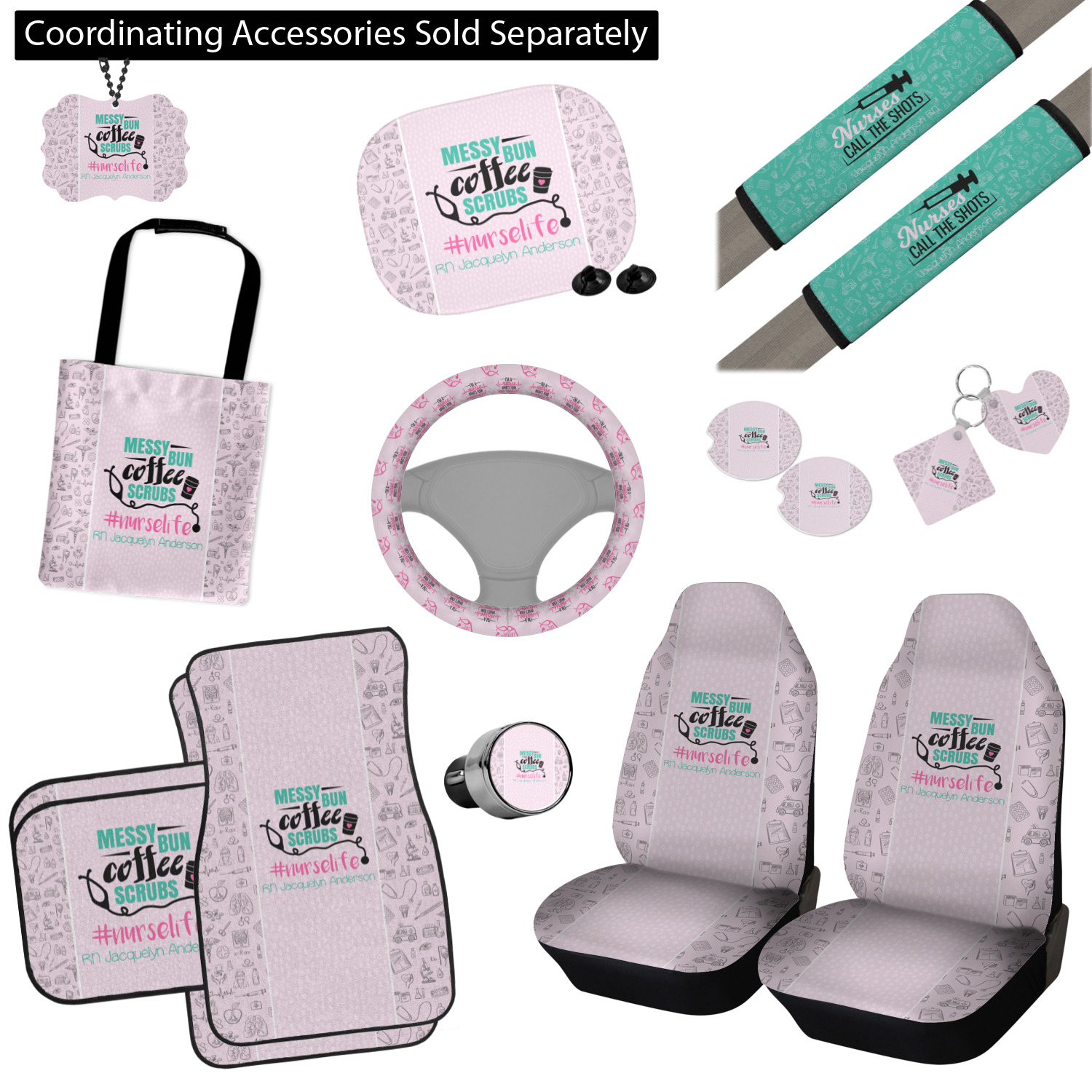 This design features a quote saying "messy bun, coffee, scrubs, #nurselife." The background has two different subtle patterns. One has subtle dots, while the other has fun illustrations of different medical tools and symbols. The two backgrounds are a soft pink. The quote has several different colors including pink, black, and teal.