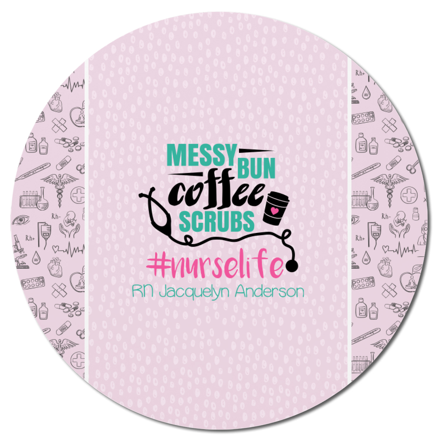 This design features a quote saying "messy bun, coffee, scrubs, #nurselife." The background has two different subtle patterns. One has subtle dots, while the other has fun illustrations of different medical tools and symbols. The two backgrounds are a soft pink. The quote has several different colors including pink, black, and teal.