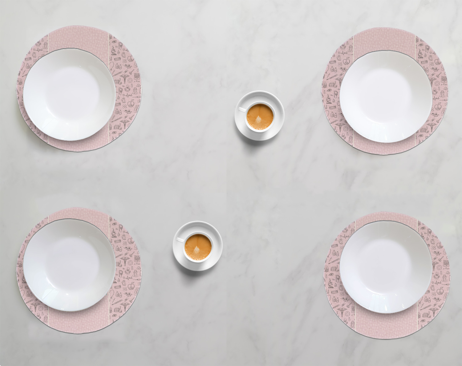 This design features a quote saying "messy bun, coffee, scrubs, #nurselife." The background has two different subtle patterns. One has subtle dots, while the other has fun illustrations of different medical tools and symbols. The two backgrounds are a soft pink. The quote has several different colors including pink, black, and teal.