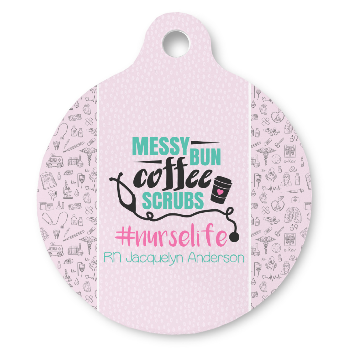 This design features a quote saying "messy bun, coffee, scrubs, #nurselife." The background has two different subtle patterns. One has subtle dots, while the other has fun illustrations of different medical tools and symbols. The two backgrounds are a soft pink. The quote has several different colors including pink, black, and teal.