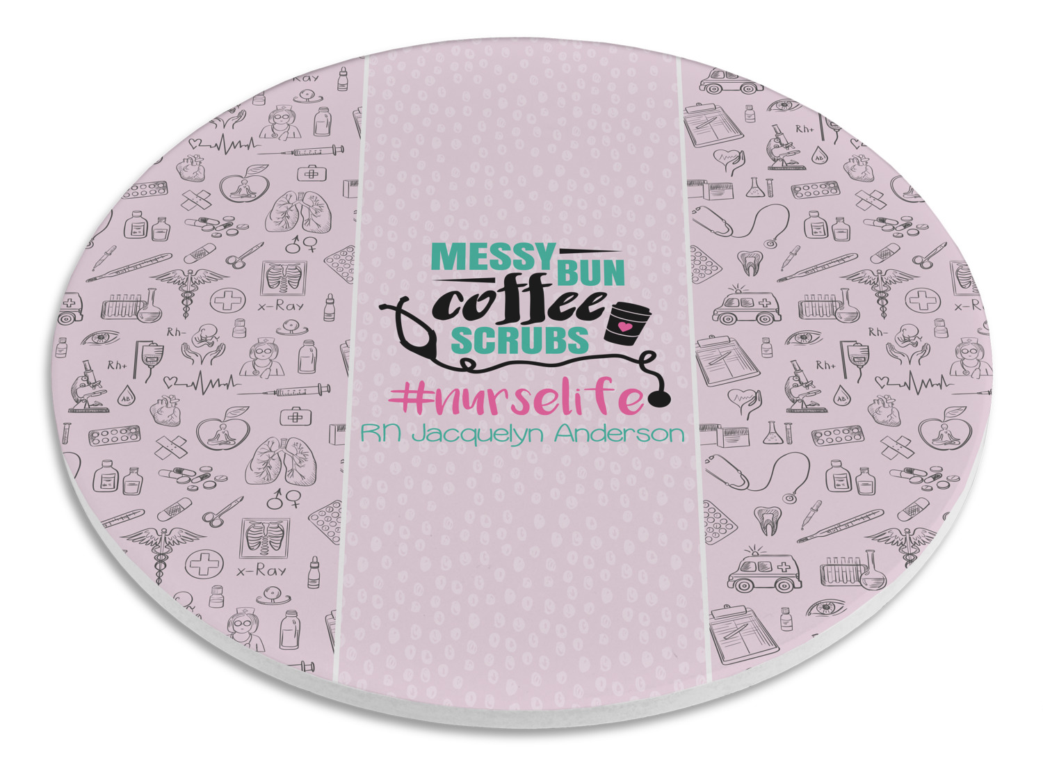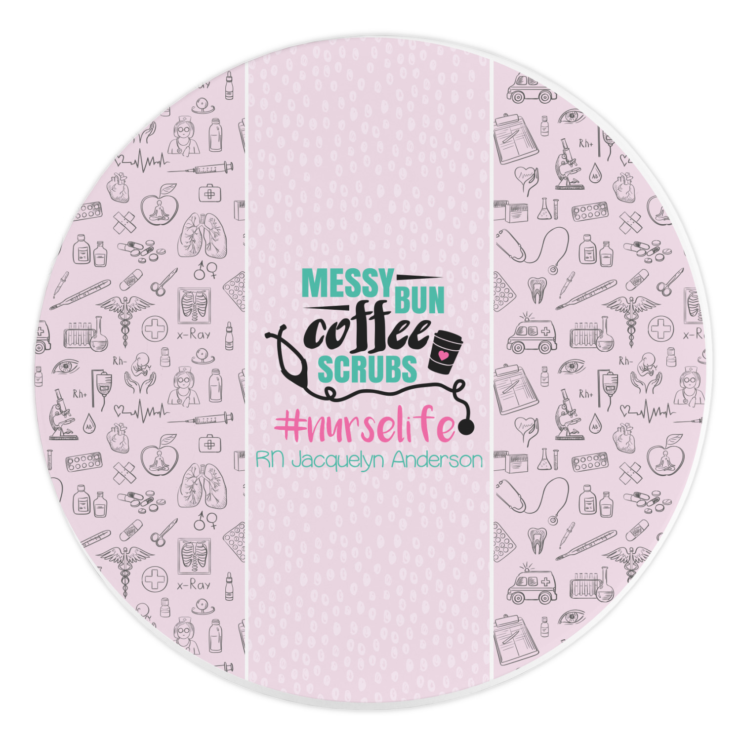 This design features a quote saying "messy bun, coffee, scrubs, #nurselife." The background has two different subtle patterns. One has subtle dots, while the other has fun illustrations of different medical tools and symbols. The two backgrounds are a soft pink. The quote has several different colors including pink, black, and teal.