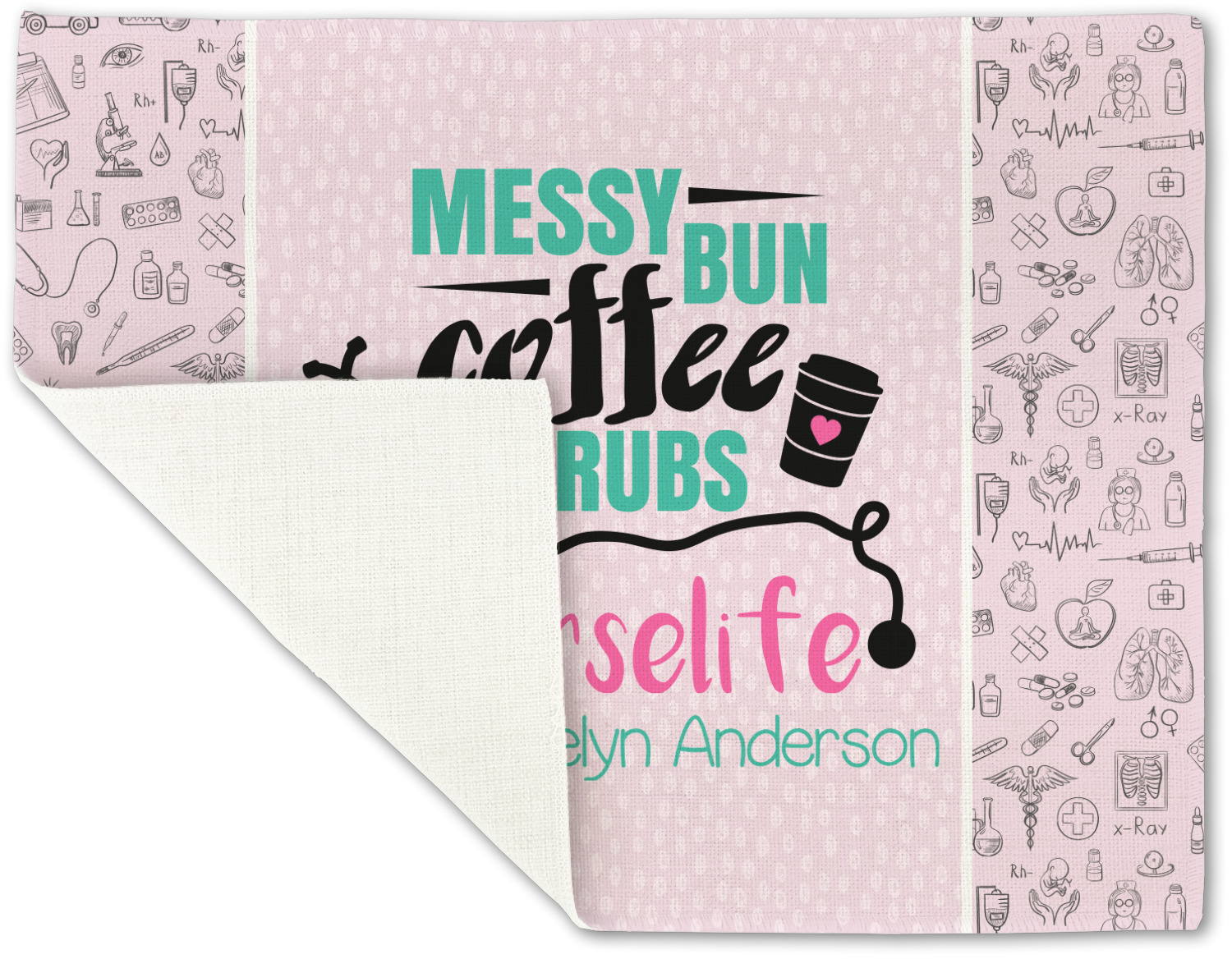 This design features a quote saying "messy bun, coffee, scrubs, #nurselife." The background has two different subtle patterns. One has subtle dots, while the other has fun illustrations of different medical tools and symbols. The two backgrounds are a soft pink. The quote has several different colors including pink, black, and teal.