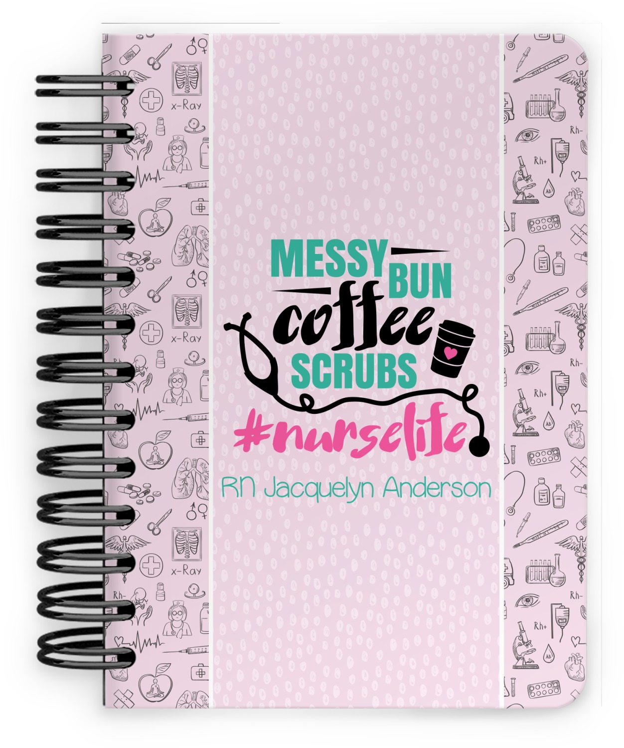 This design features a quote saying "messy bun, coffee, scrubs, #nurselife." The background has two different subtle patterns. One has subtle dots, while the other has fun illustrations of different medical tools and symbols. The two backgrounds are a soft pink. The quote has several different colors including pink, black, and teal.