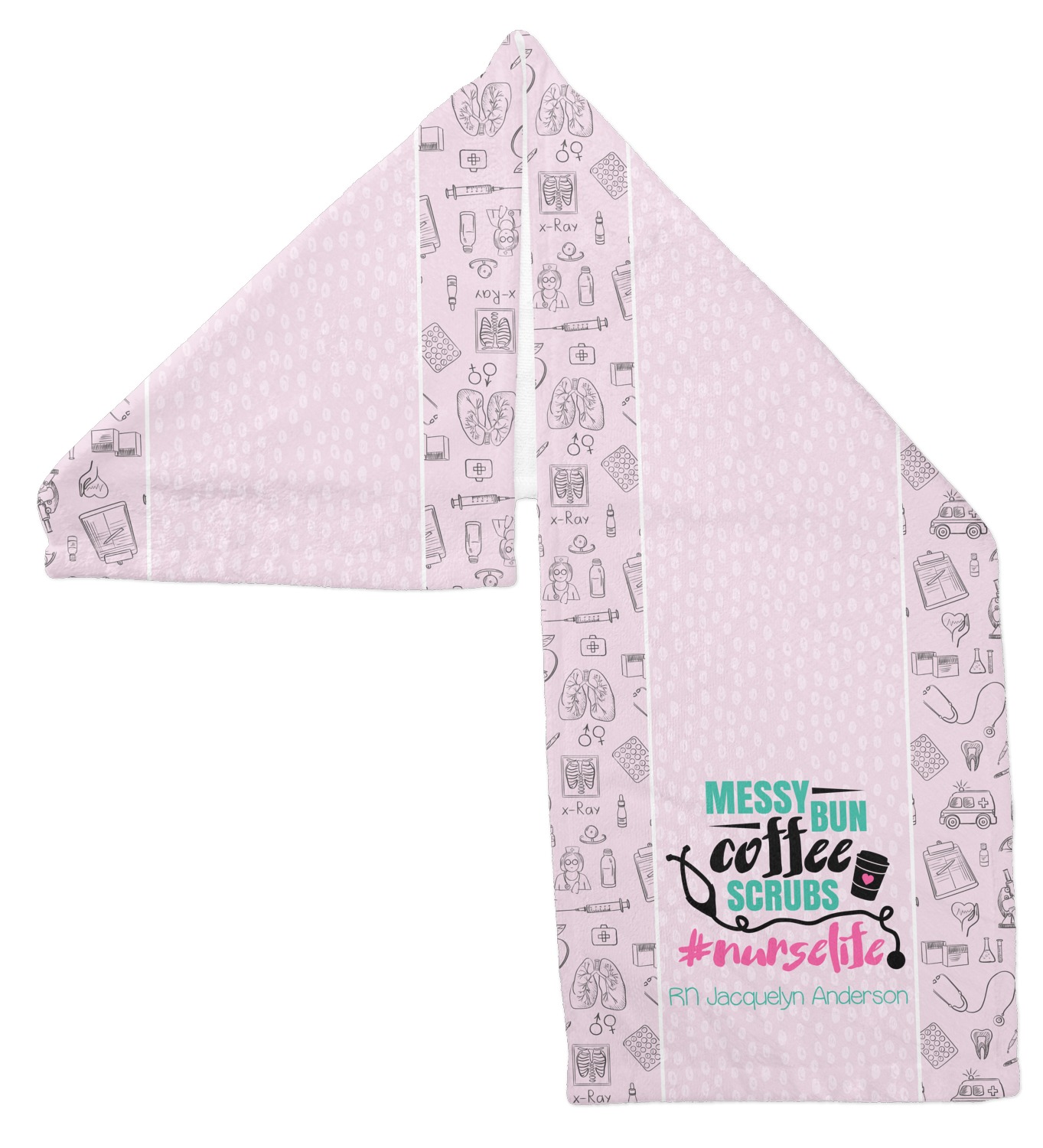 This design features a quote saying "messy bun, coffee, scrubs, #nurselife." The background has two different subtle patterns. One has subtle dots, while the other has fun illustrations of different medical tools and symbols. The two backgrounds are a soft pink. The quote has several different colors including pink, black, and teal.