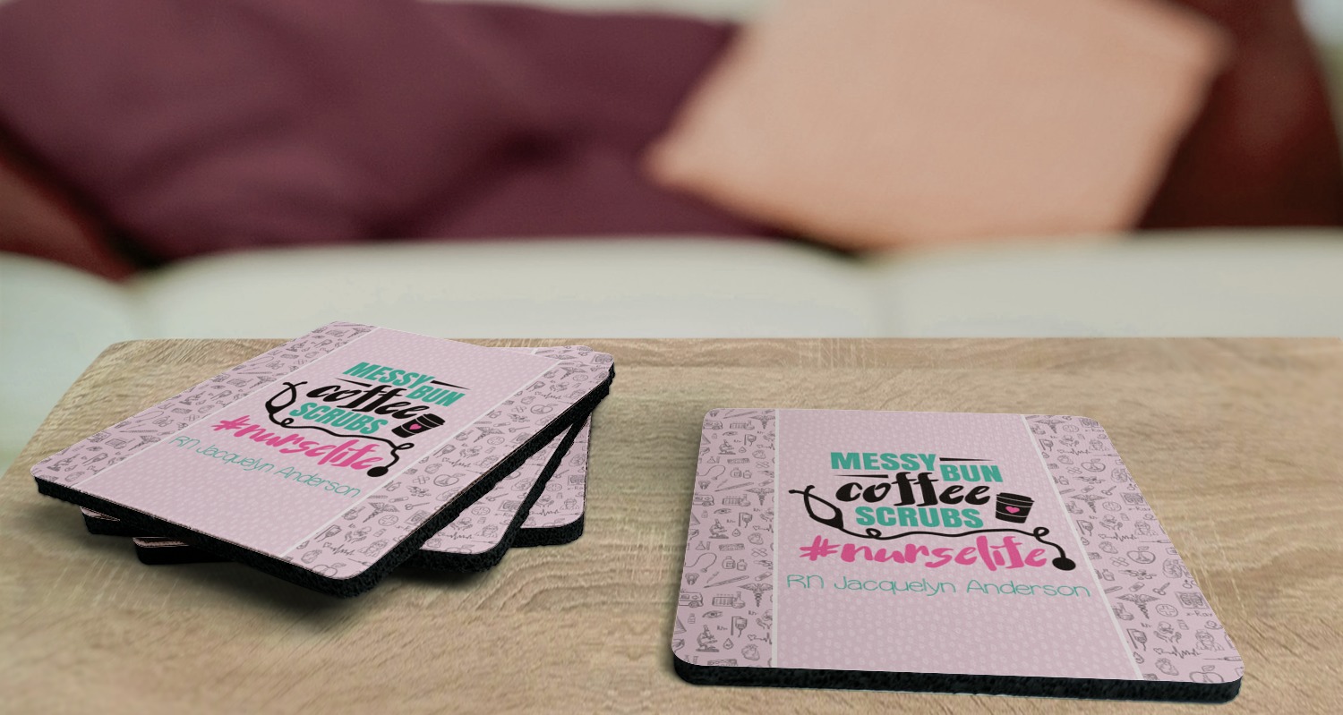 These drink coasters have a smooth, polyester top and a textured, rubber backing on its bottom. The non-slip rubber backing underneath works to keep any spills at bay. At 4 by 4 by 0.25 inches thick, these custom coasters are a suitable size for most drinkware. Your personalization is displayed atop the face of the cup coaster. We sell these rubber coasters in two different shapes: square and round. You can buy each shape as singulars or as a set of 4.