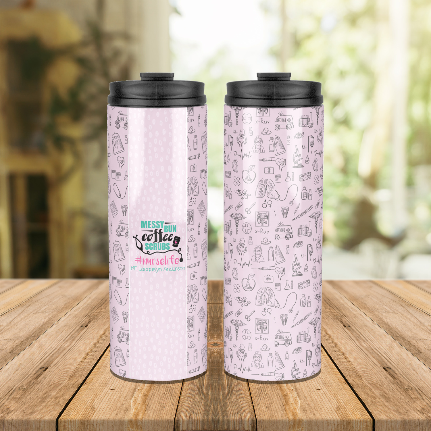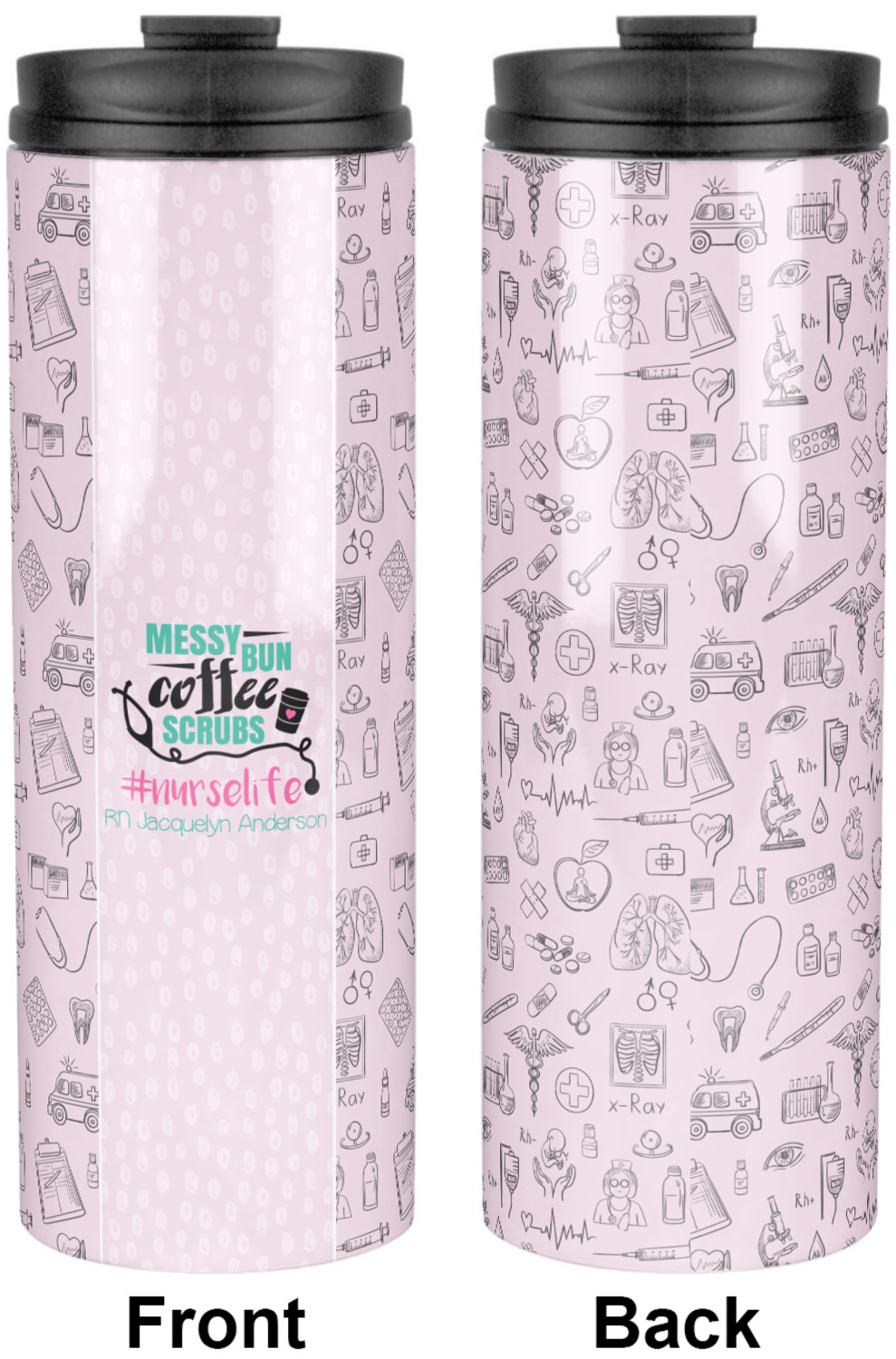 This design features a quote saying "messy bun, coffee, scrubs, #nurselife." The background has two different subtle patterns. One has subtle dots, while the other has fun illustrations of different medical tools and symbols. The two backgrounds are a soft pink. The quote has several different colors including pink, black, and teal.