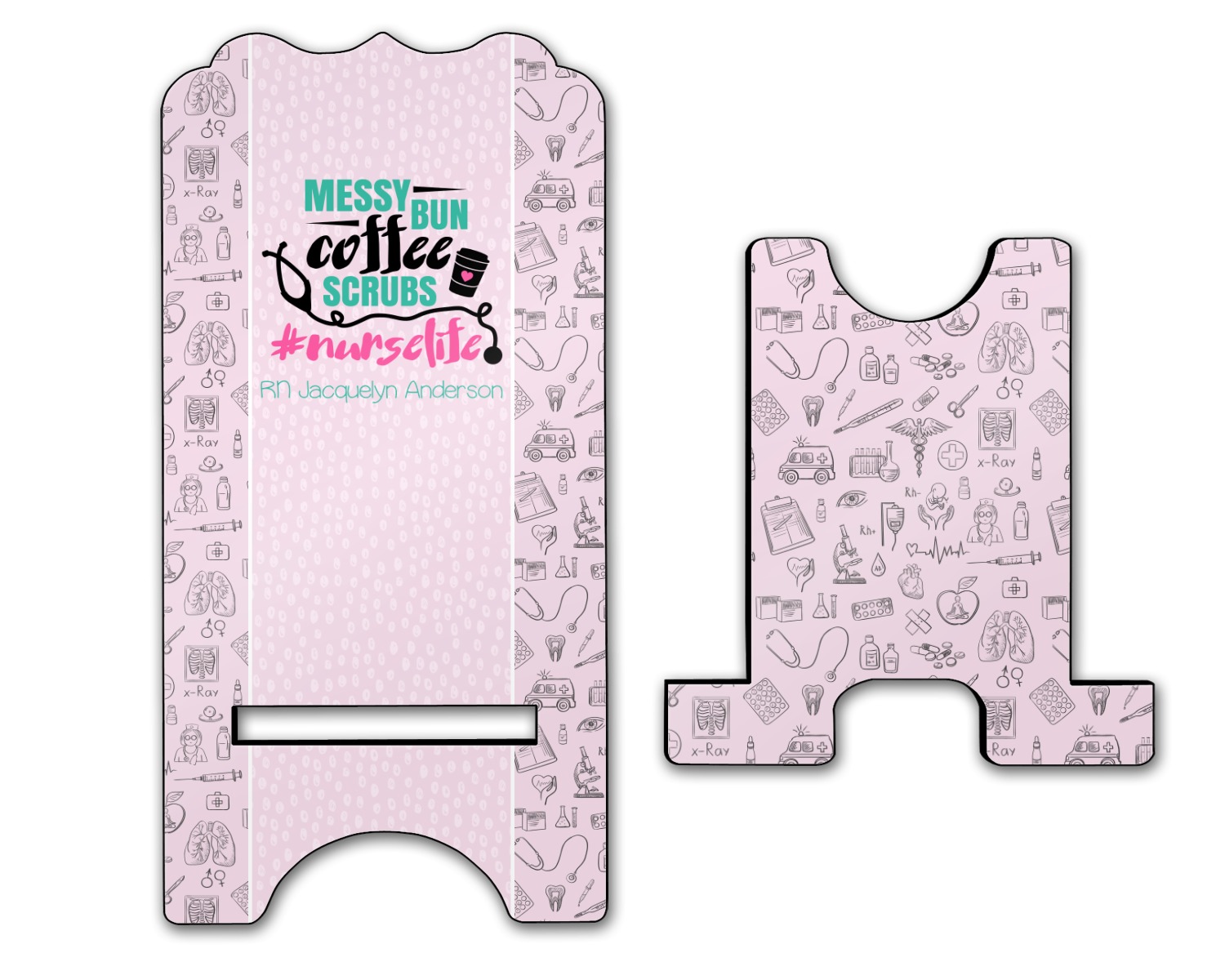 This design features a quote saying "messy bun, coffee, scrubs, #nurselife." The background has two different subtle patterns. One has subtle dots, while the other has fun illustrations of different medical tools and symbols. The two backgrounds are a soft pink. The quote has several different colors including pink, black, and teal.