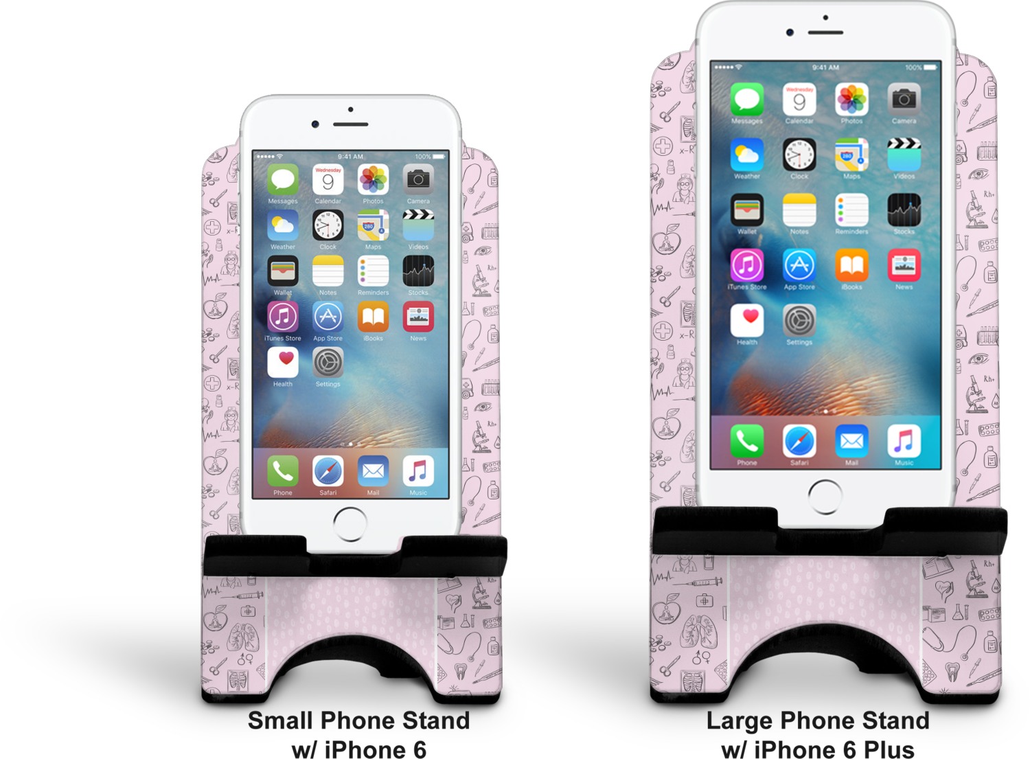 To meet your needs, we offer four variations of this IPhone stand. The backboard of the first version is shaped as a plain, yet sleek rectangle, and is available in two sizes. Our smaller size is approximately 4 by 3.25 by 7 inches, while the larger model is 4 by 3.77 by 8.5 inches. Alongside this model, we also provide you with a more decorative option. The upper part of our second version features a curved edge, for a classy, suave appearance. This phone holder is also sold in two sizes: a smaller version, which is 4 by 3.25 by 7 inches, and our larger model, which is 4 by 3.77 by 8.5 inches. Both models will support large phones, but the larger model is better if you wish to proudly display your personalized design.