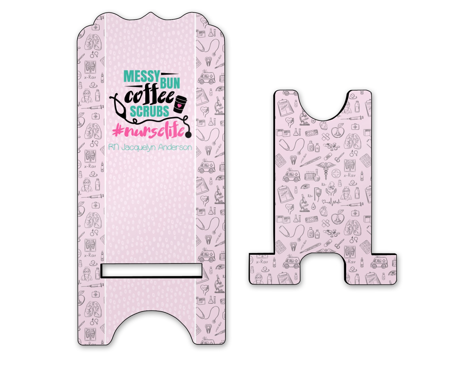 This design features a quote saying "messy bun, coffee, scrubs, #nurselife." The background has two different subtle patterns. One has subtle dots, while the other has fun illustrations of different medical tools and symbols. The two backgrounds are a soft pink. The quote has several different colors including pink, black, and teal.