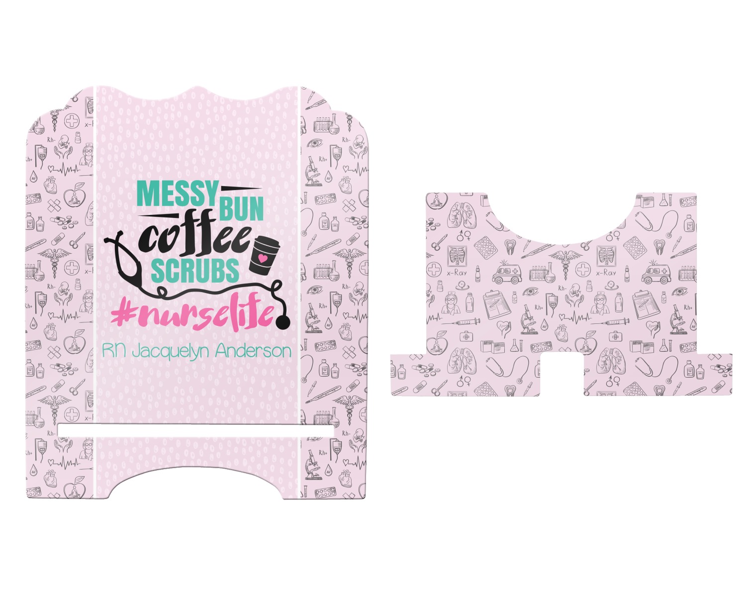 This design features a quote saying "messy bun, coffee, scrubs, #nurselife." The background has two different subtle patterns. One has subtle dots, while the other has fun illustrations of different medical tools and symbols. The two backgrounds are a soft pink. The quote has several different colors including pink, black, and teal.