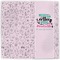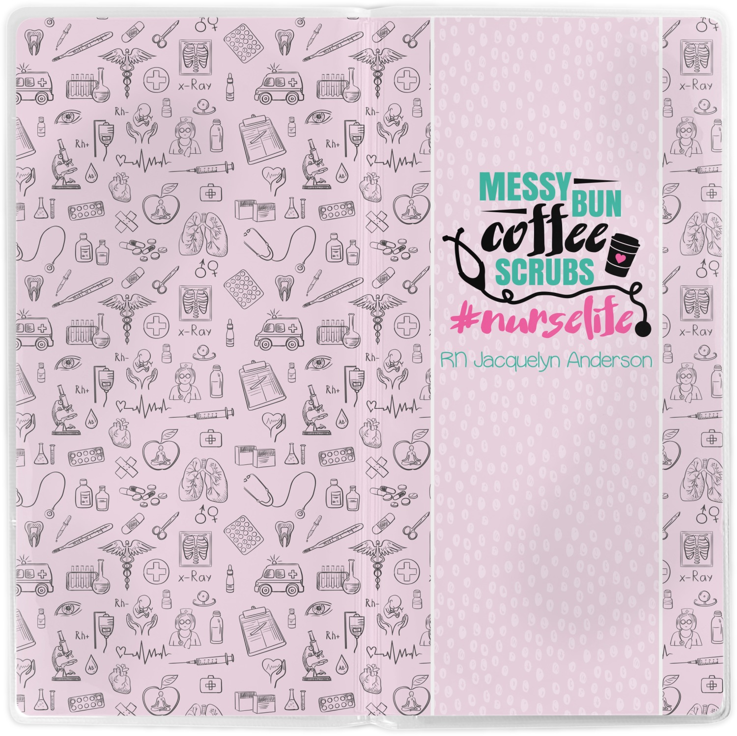 This design features a quote saying "messy bun, coffee, scrubs, #nurselife." The background has two different subtle patterns. One has subtle dots, while the other has fun illustrations of different medical tools and symbols. The two backgrounds are a soft pink. The quote has several different colors including pink, black, and teal.