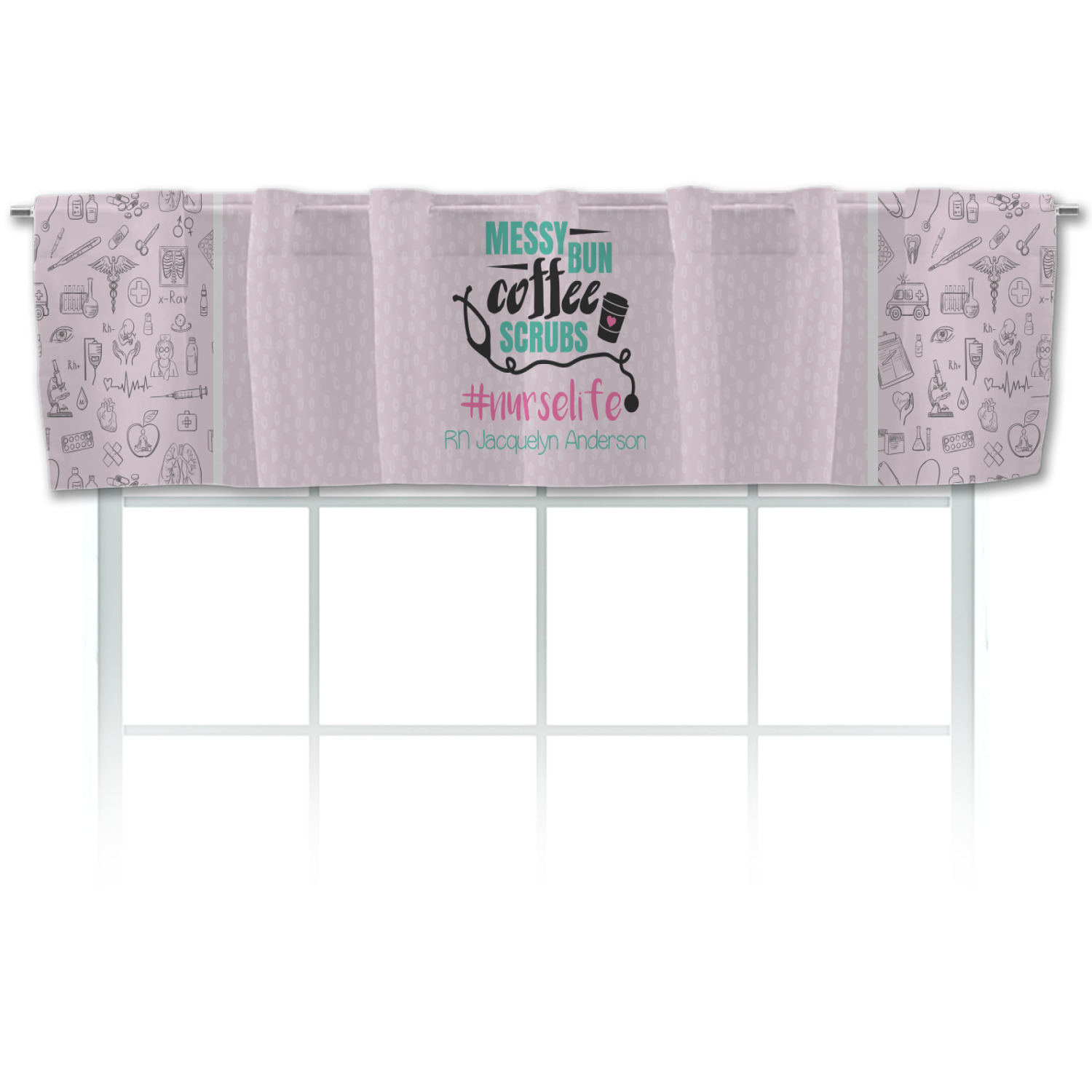 This design features a quote saying "messy bun, coffee, scrubs, #nurselife." The background has two different subtle patterns. One has subtle dots, while the other has fun illustrations of different medical tools and symbols. The two backgrounds are a soft pink. The quote has several different colors including pink, black, and teal.