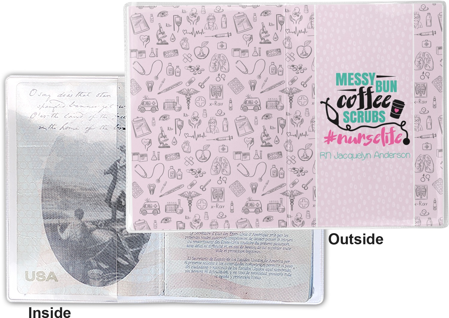 This cover is made of a sturdy clear vinyl with a personalized vinyl insert inside. There is a large and a small pocket on either side to hold the covers of your passport easily and firmly. The passport holder is approximately 7.5" x 5.25", the perfect size to snugly fit your passport. This slim cover is the perfect way to protect your passport without being one more bulky item you have to carry.