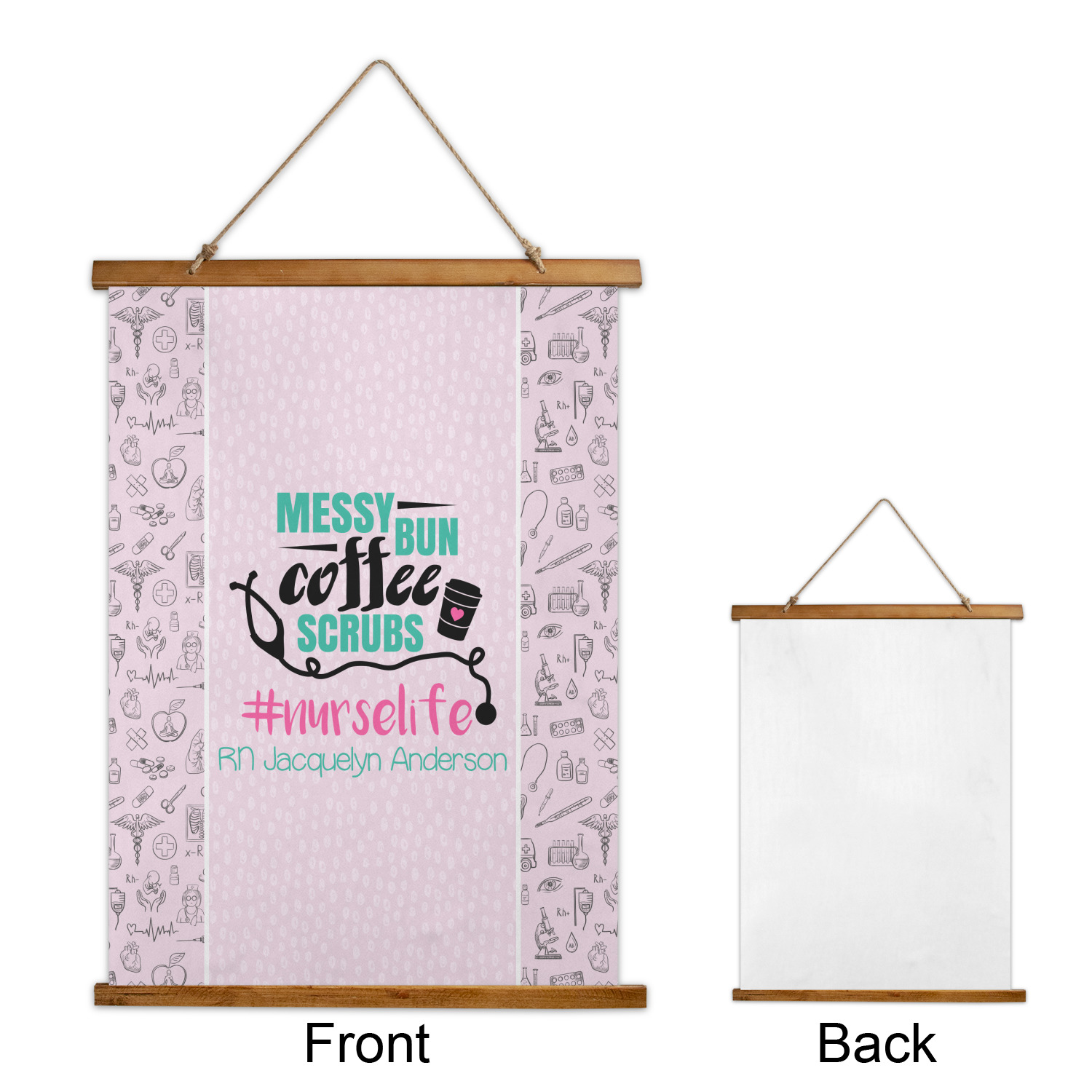 This design features a quote saying "messy bun, coffee, scrubs, #nurselife." The background has two different subtle patterns. One has subtle dots, while the other has fun illustrations of different medical tools and symbols. The two backgrounds are a soft pink. The quote has several different colors including pink, black, and teal.
