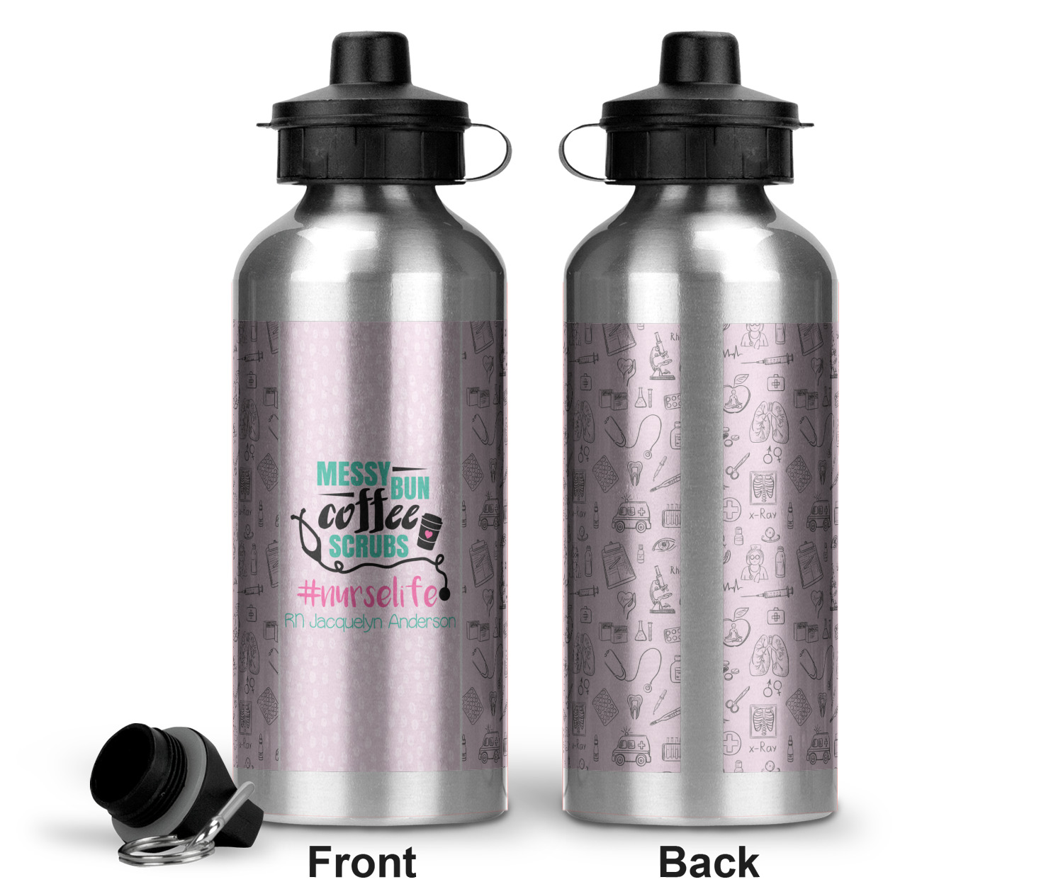 This design features a quote saying "messy bun, coffee, scrubs, #nurselife." The background has two different subtle patterns. One has subtle dots, while the other has fun illustrations of different medical tools and symbols. The two backgrounds are a soft pink. The quote has several different colors including pink, black, and teal.