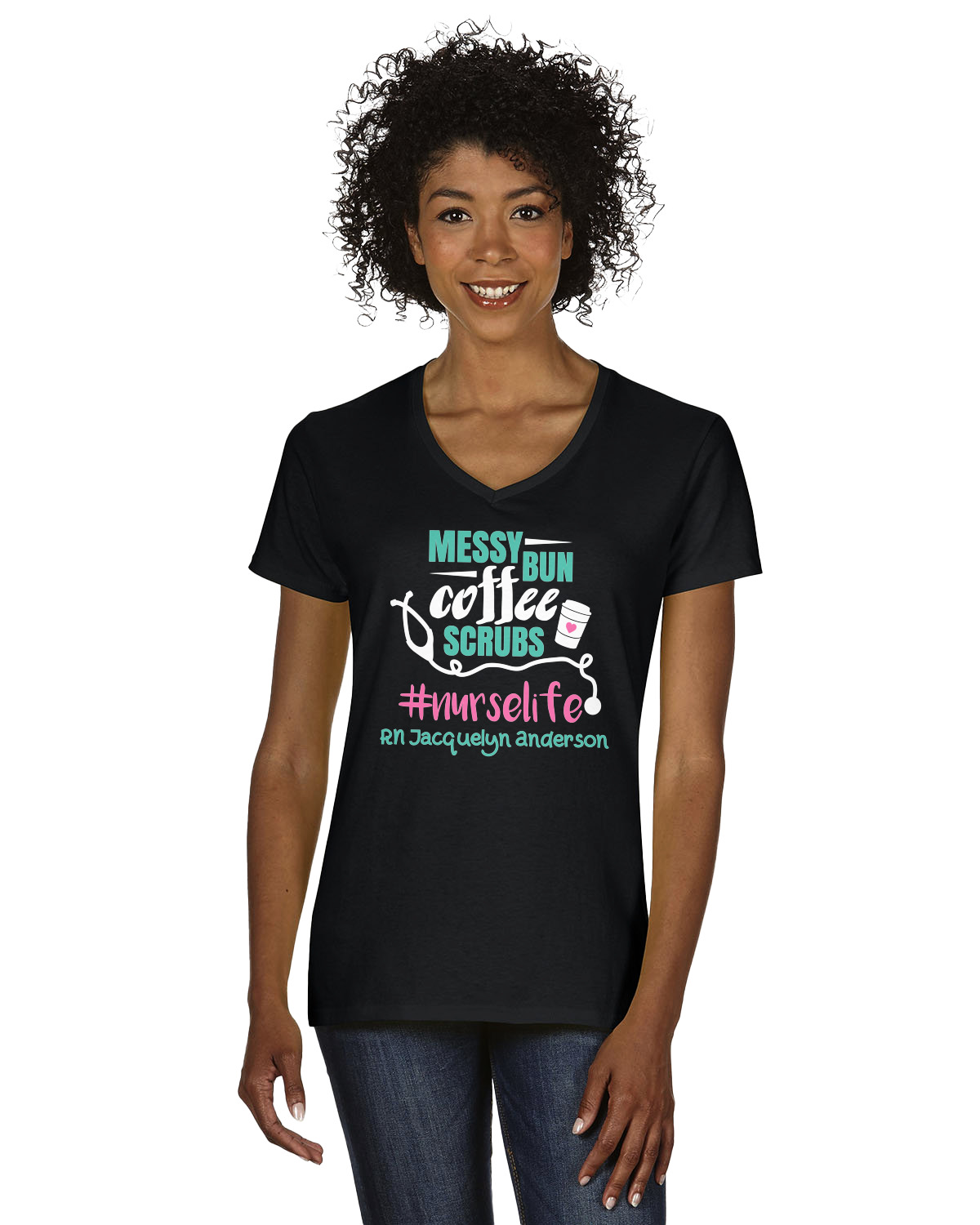 This design features a quote saying "messy bun, coffee, scrubs, #nurselife." The background has two different subtle patterns. One has subtle dots, while the other has fun illustrations of different medical tools and symbols. The two backgrounds are a soft pink. The quote has several different colors including pink, black, and teal.